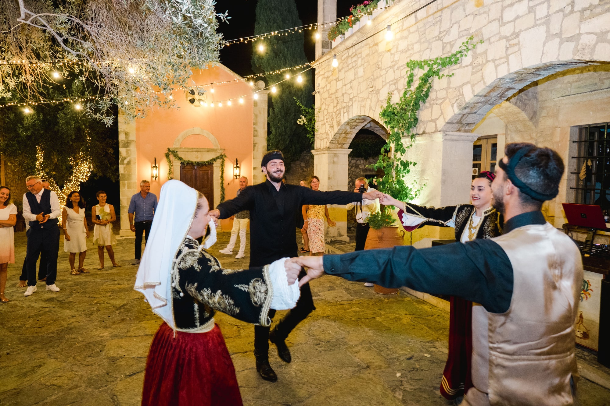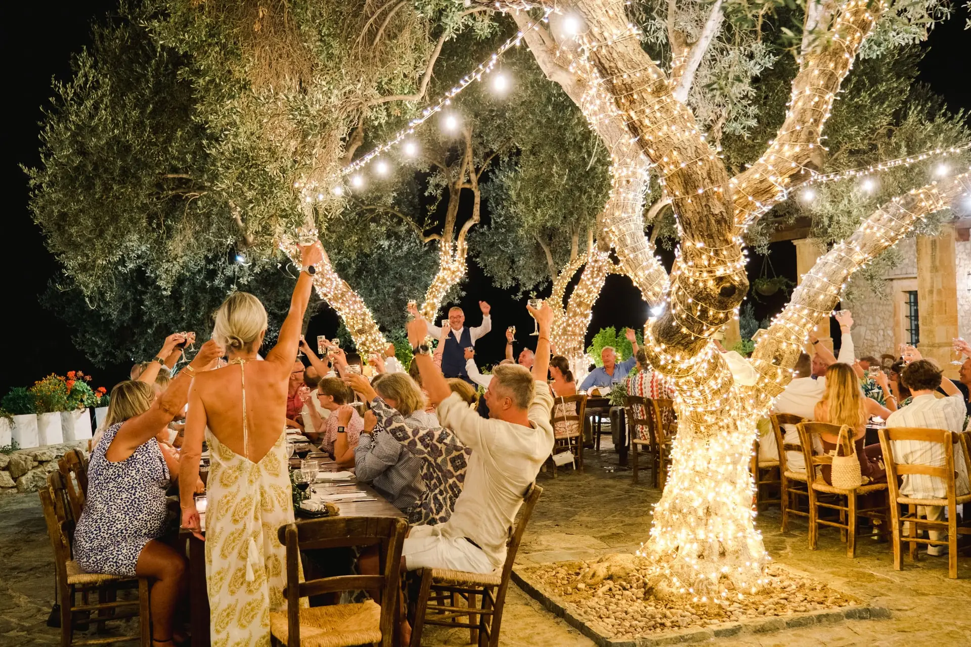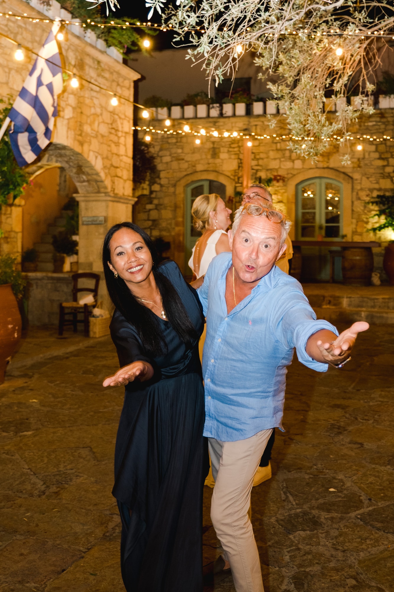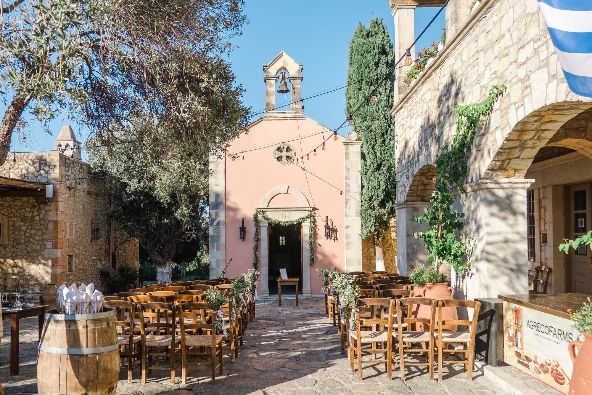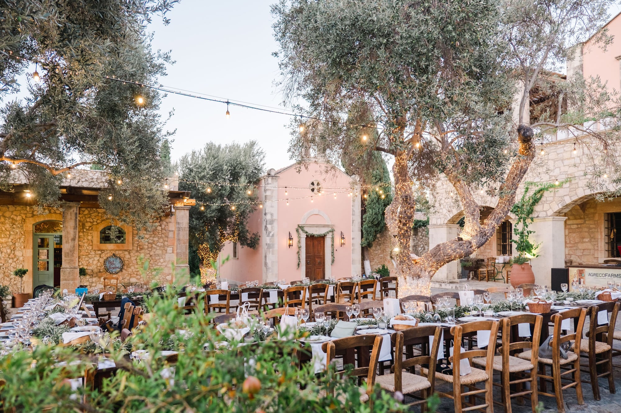 Ce mariage en Crète s’est déroulé à Agreco Farm, près de Rethymnon, dans un cadre authentique mêlant nature, pierre et traditions locales. Entourés d’oliviers et de bâtiments en pierre typiquement crétois, les mariés ont célébré leur union dans une ambiance chaleureuse et conviviale. Après la cérémonie, les invités ont partagé un cocktail puis un dîner en plein air autour de longues tables élégamment décorées de fleurs et de feuillage méditerranéen. À la nuit tombée, les guirlandes lumineuses ont illuminé la réception, laissant place à une soirée festive rythmée par des danses traditionnelles crétoises et des moments de joie spontanés, reflétant l’âme d’un véritable mariage destination en Crète.