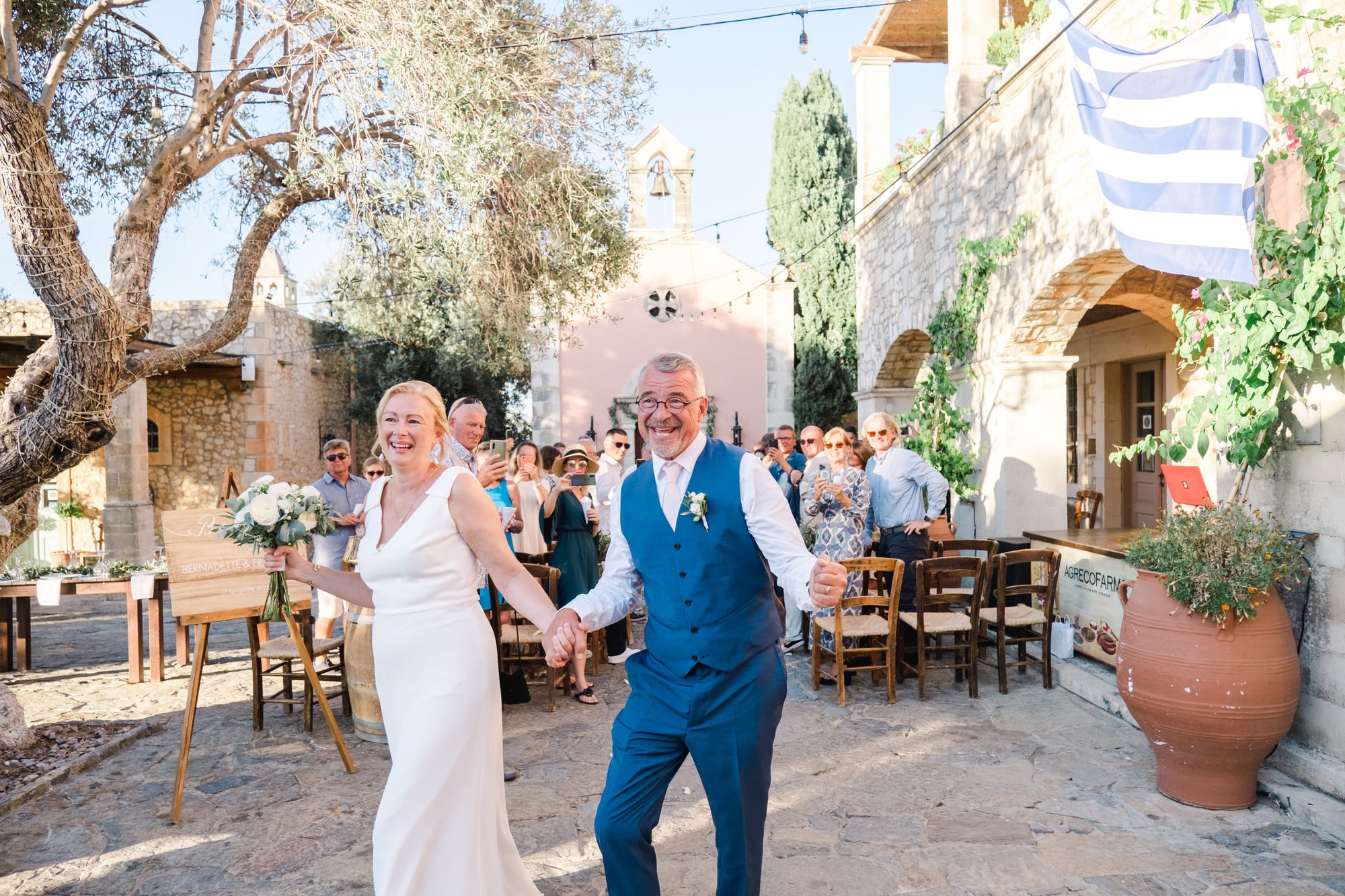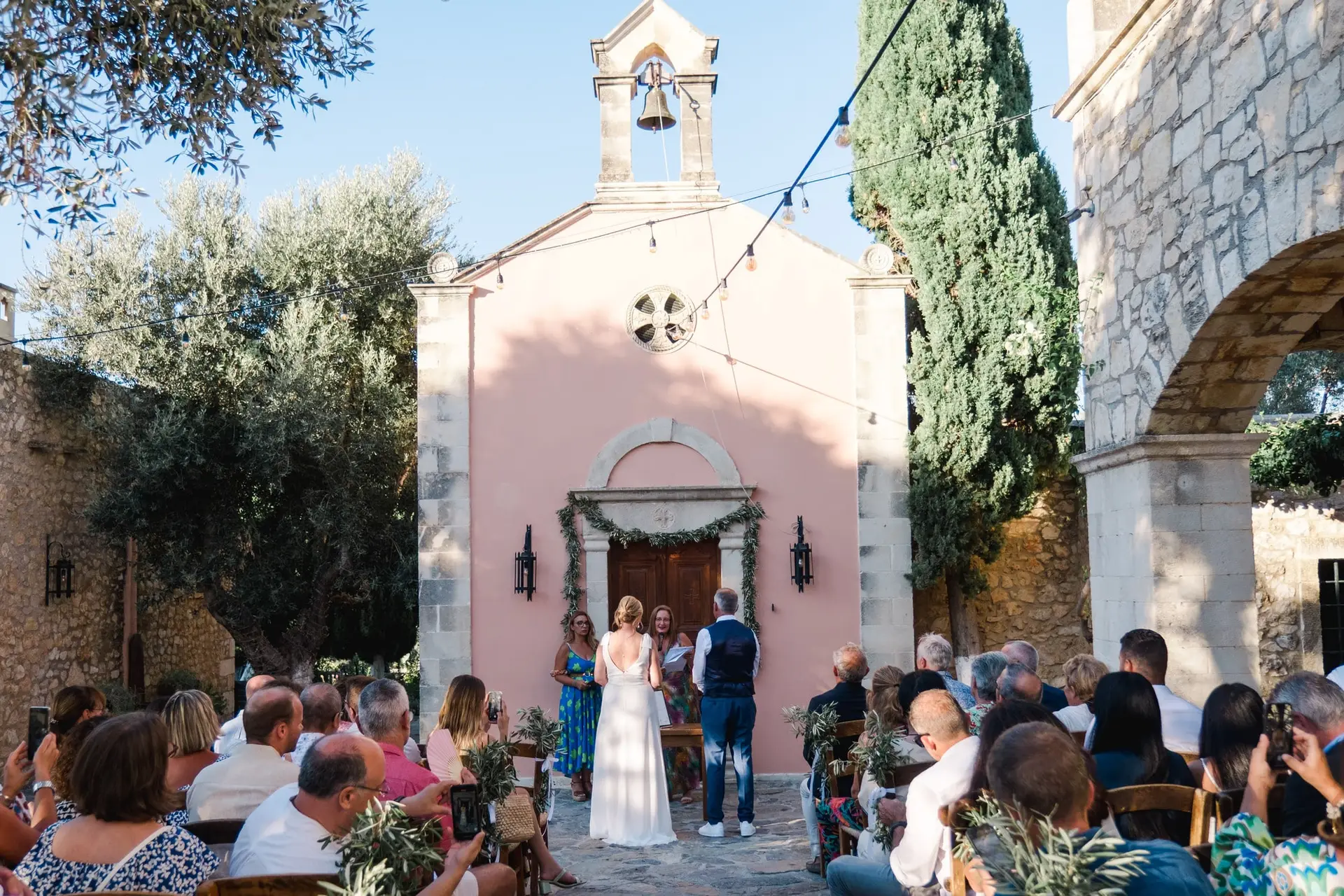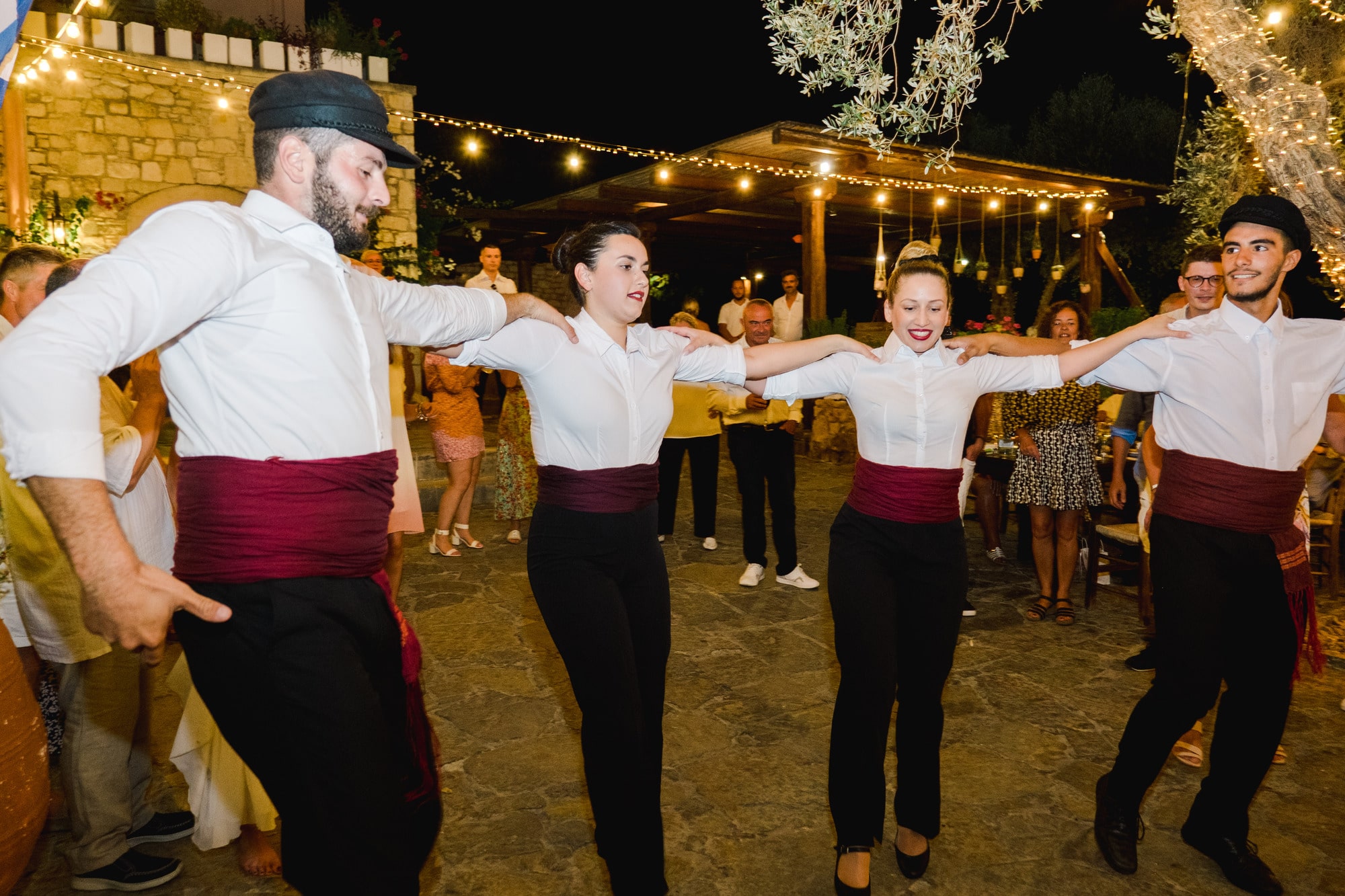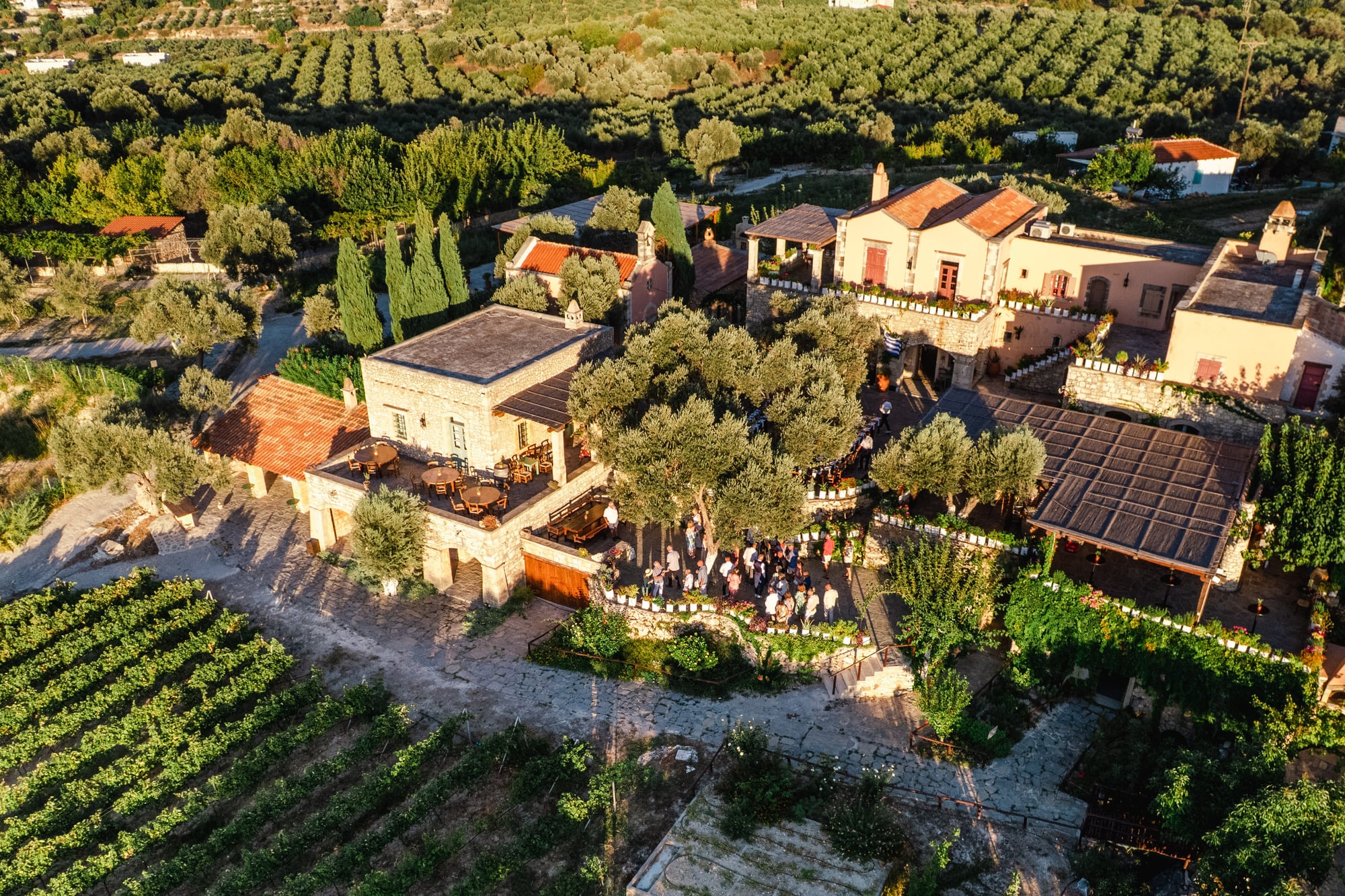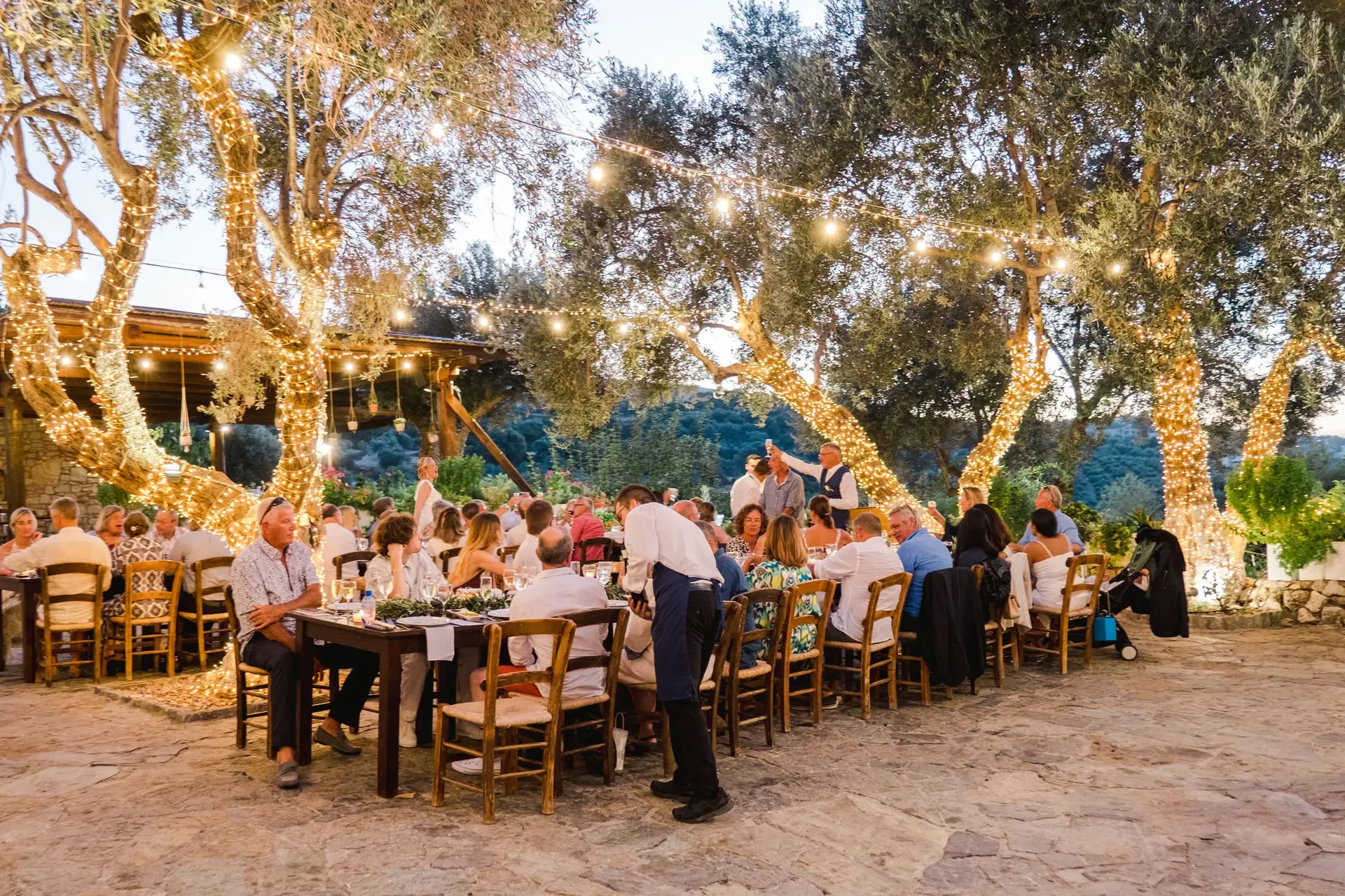 Ce mariage en Crète s’est déroulé à Agreco Farm, près de Rethymnon, dans un cadre authentique mêlant nature, pierre et traditions locales. Entourés d’oliviers et de bâtiments en pierre typiquement crétois, les mariés ont célébré leur union dans une ambiance chaleureuse et conviviale. Après la cérémonie, les invités ont partagé un cocktail puis un dîner en plein air autour de longues tables élégamment décorées de fleurs et de feuillage méditerranéen. À la nuit tombée, les guirlandes lumineuses ont illuminé la réception, laissant place à une soirée festive rythmée par des danses traditionnelles crétoises et des moments de joie spontanés, reflétant l’âme d’un véritable mariage destination en Crète.