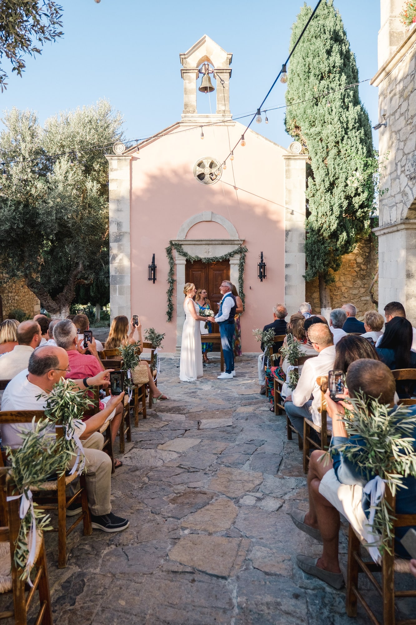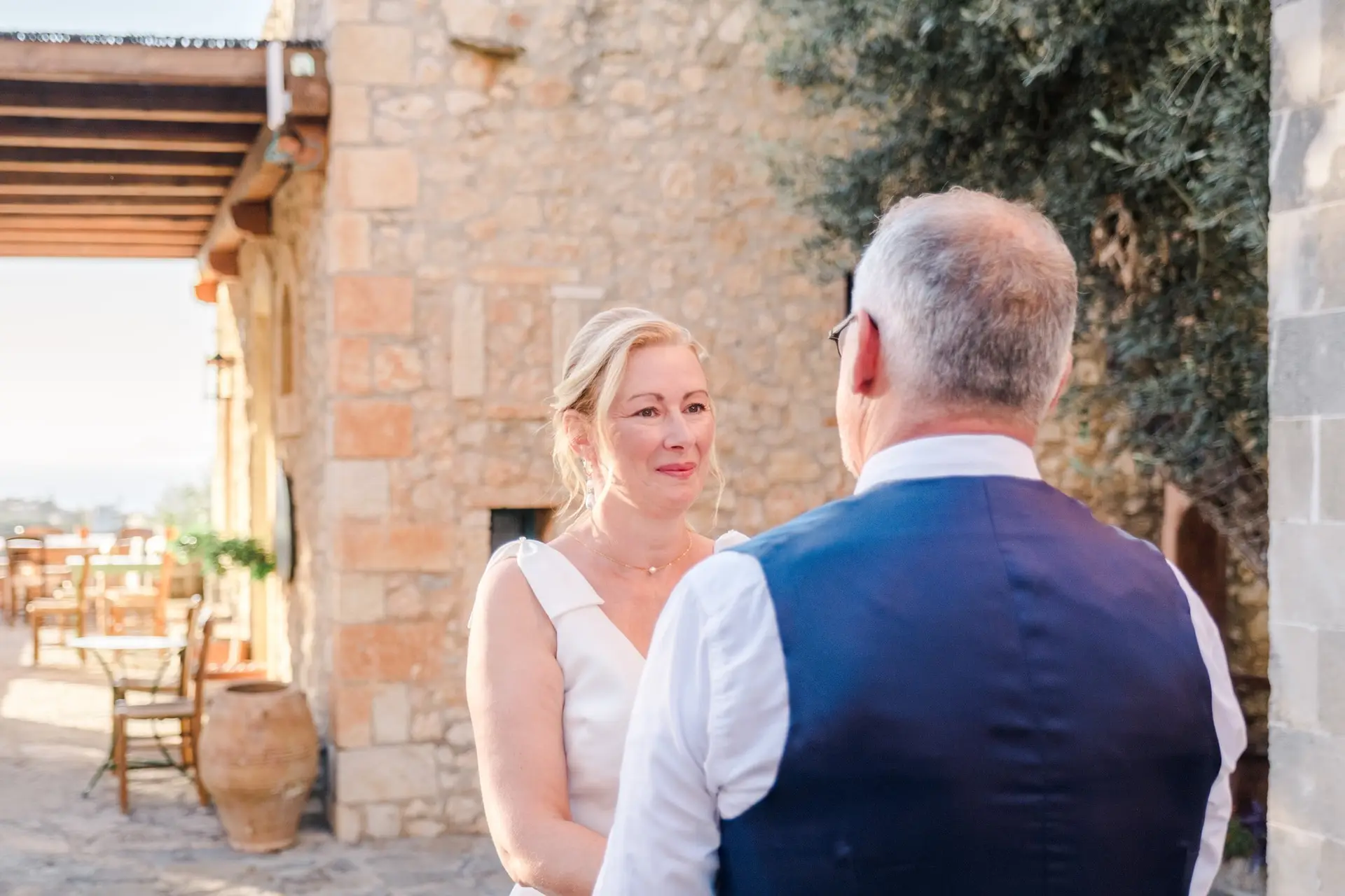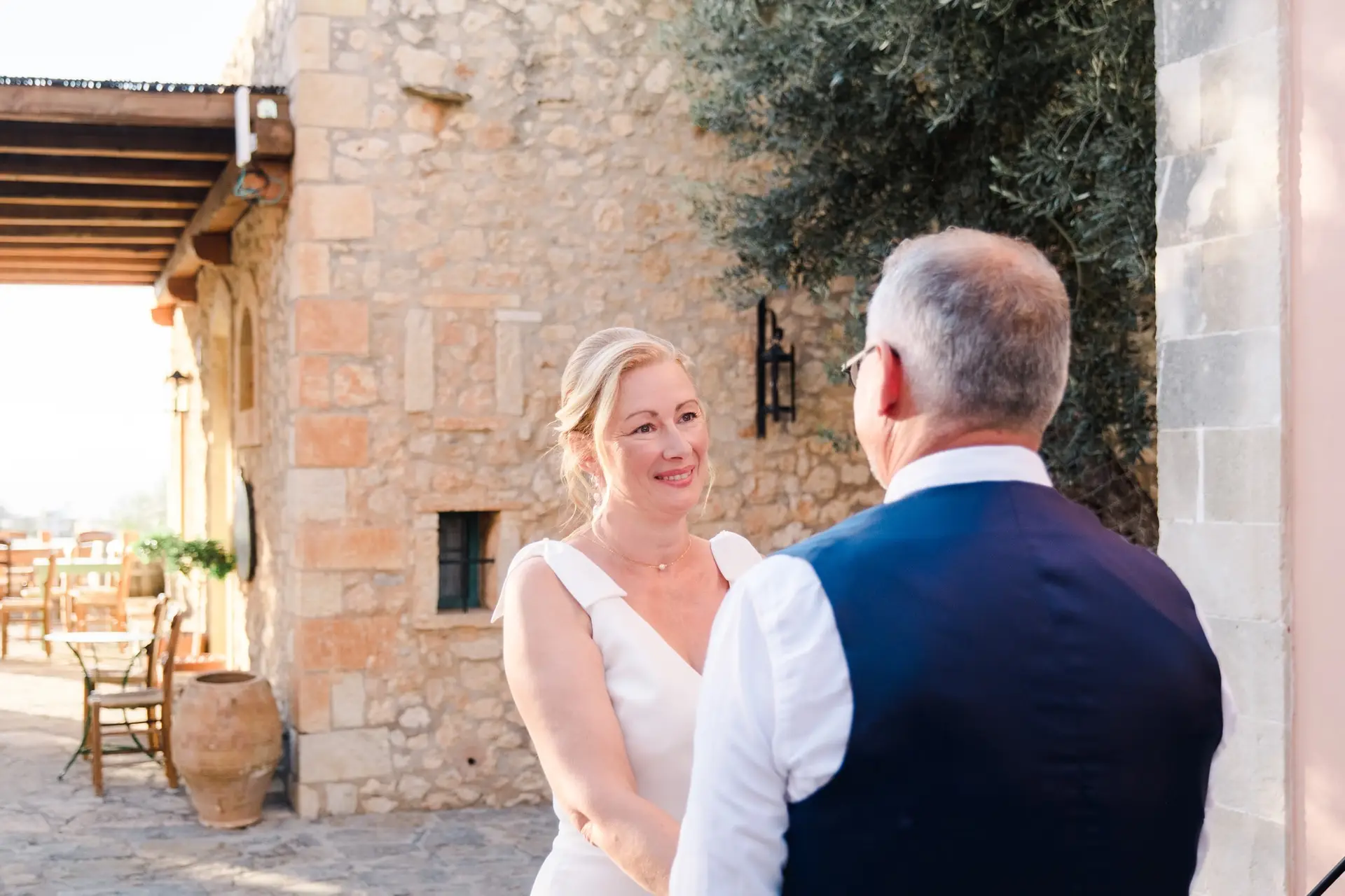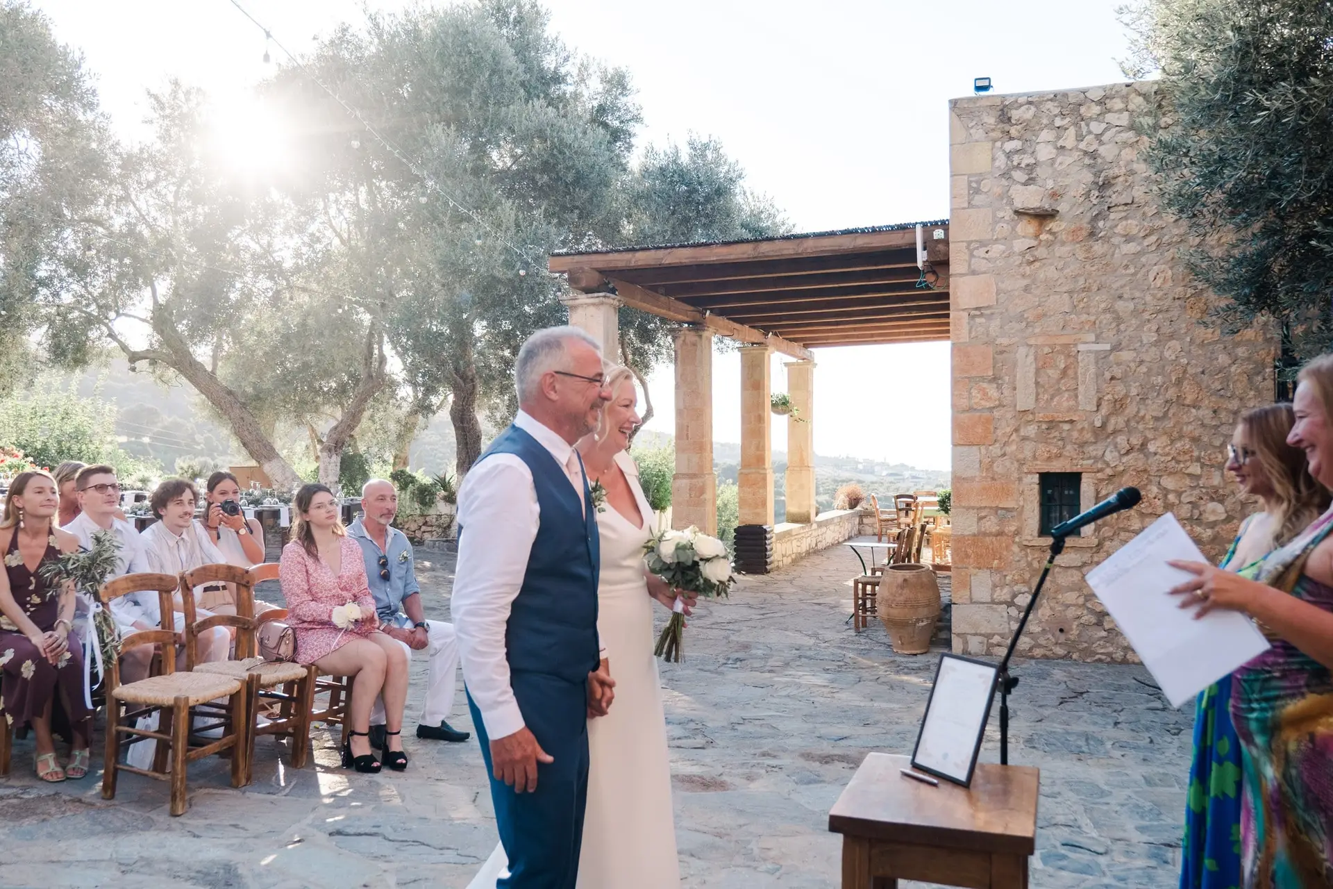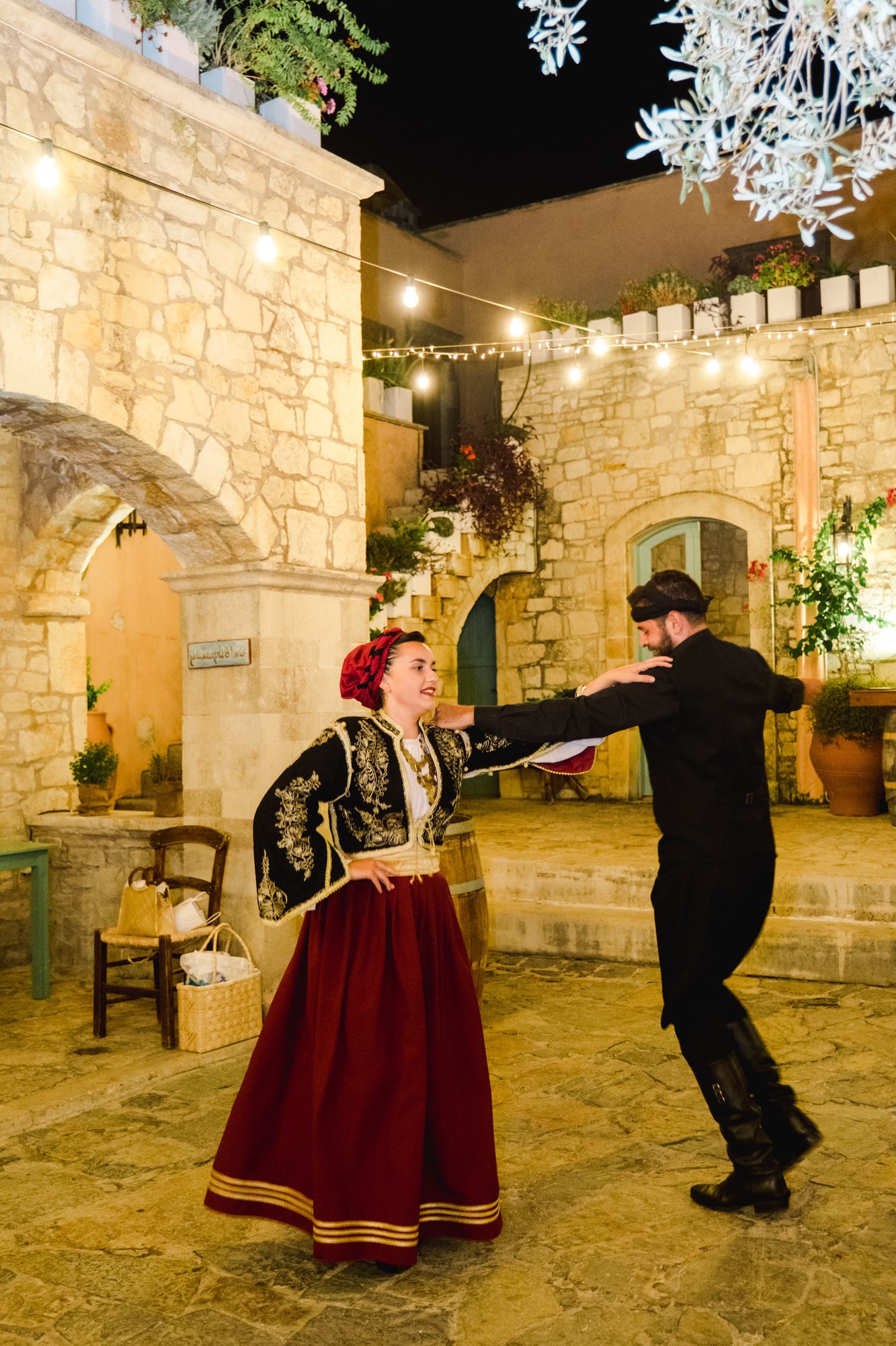 Ce mariage en Crète s’est déroulé à Agreco Farm, près de Rethymnon, dans un cadre authentique mêlant nature, pierre et traditions locales. Entourés d’oliviers et de bâtiments en pierre typiquement crétois, les mariés ont célébré leur union dans une ambiance chaleureuse et conviviale. Après la cérémonie, les invités ont partagé un cocktail puis un dîner en plein air autour de longues tables élégamment décorées de fleurs et de feuillage méditerranéen. À la nuit tombée, les guirlandes lumineuses ont illuminé la réception, laissant place à une soirée festive rythmée par des danses traditionnelles crétoises et des moments de joie spontanés, reflétant l’âme d’un véritable mariage destination en Crète.
