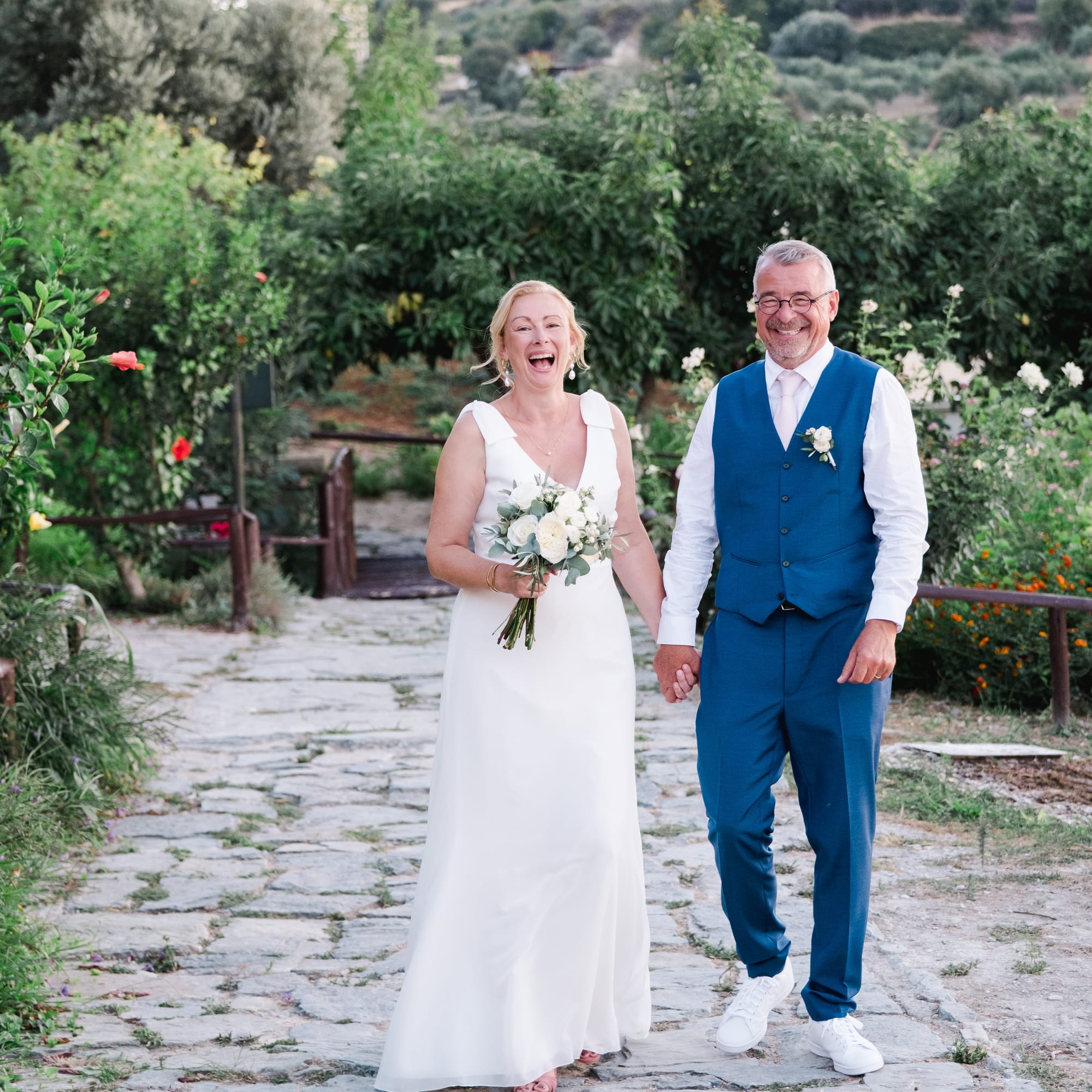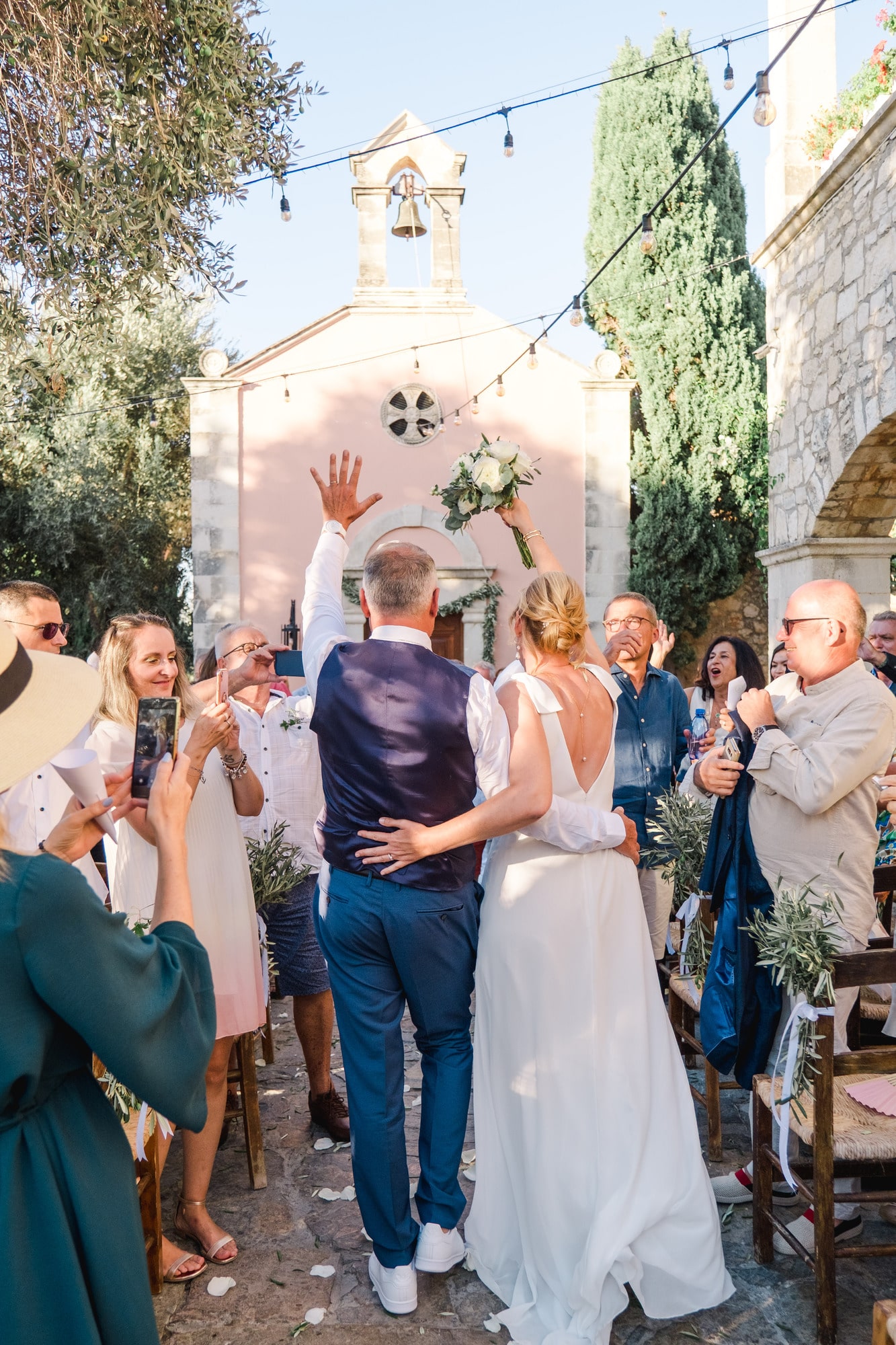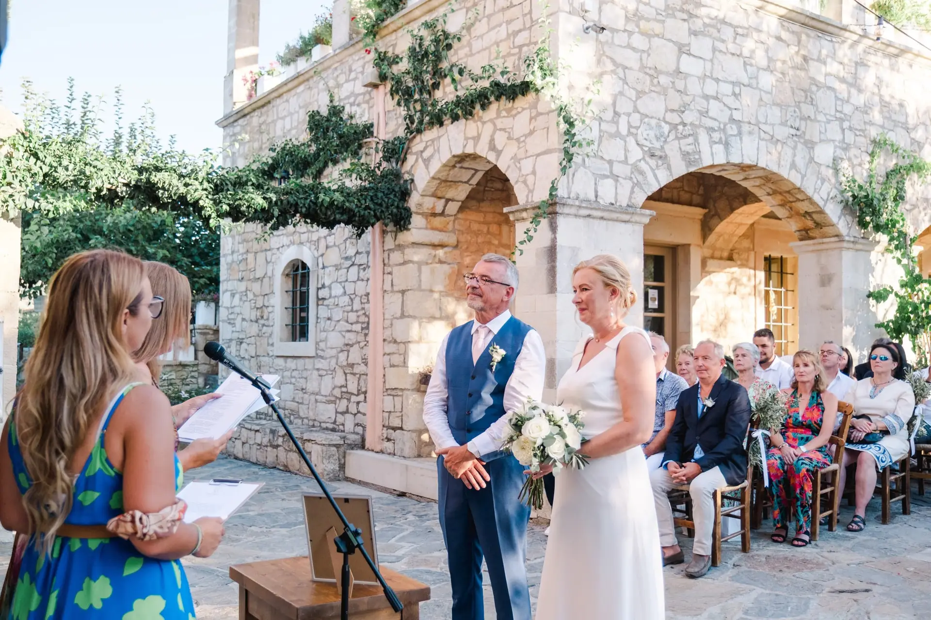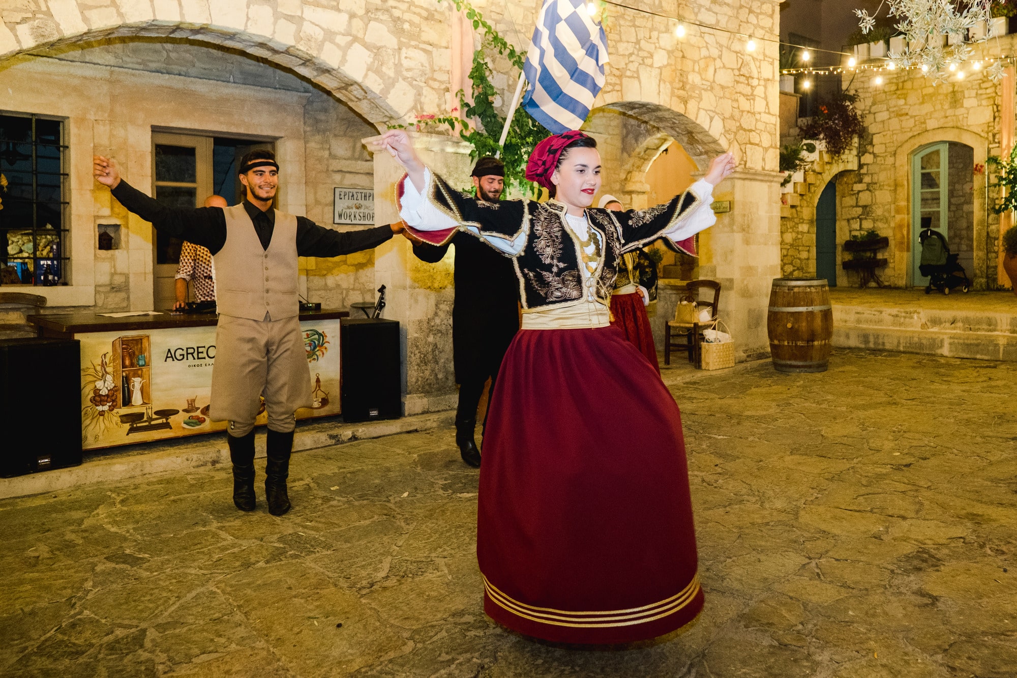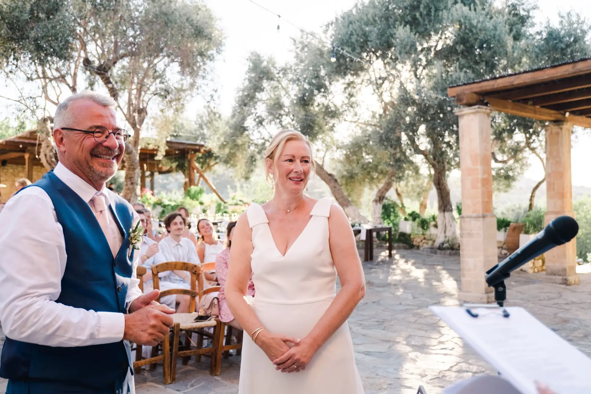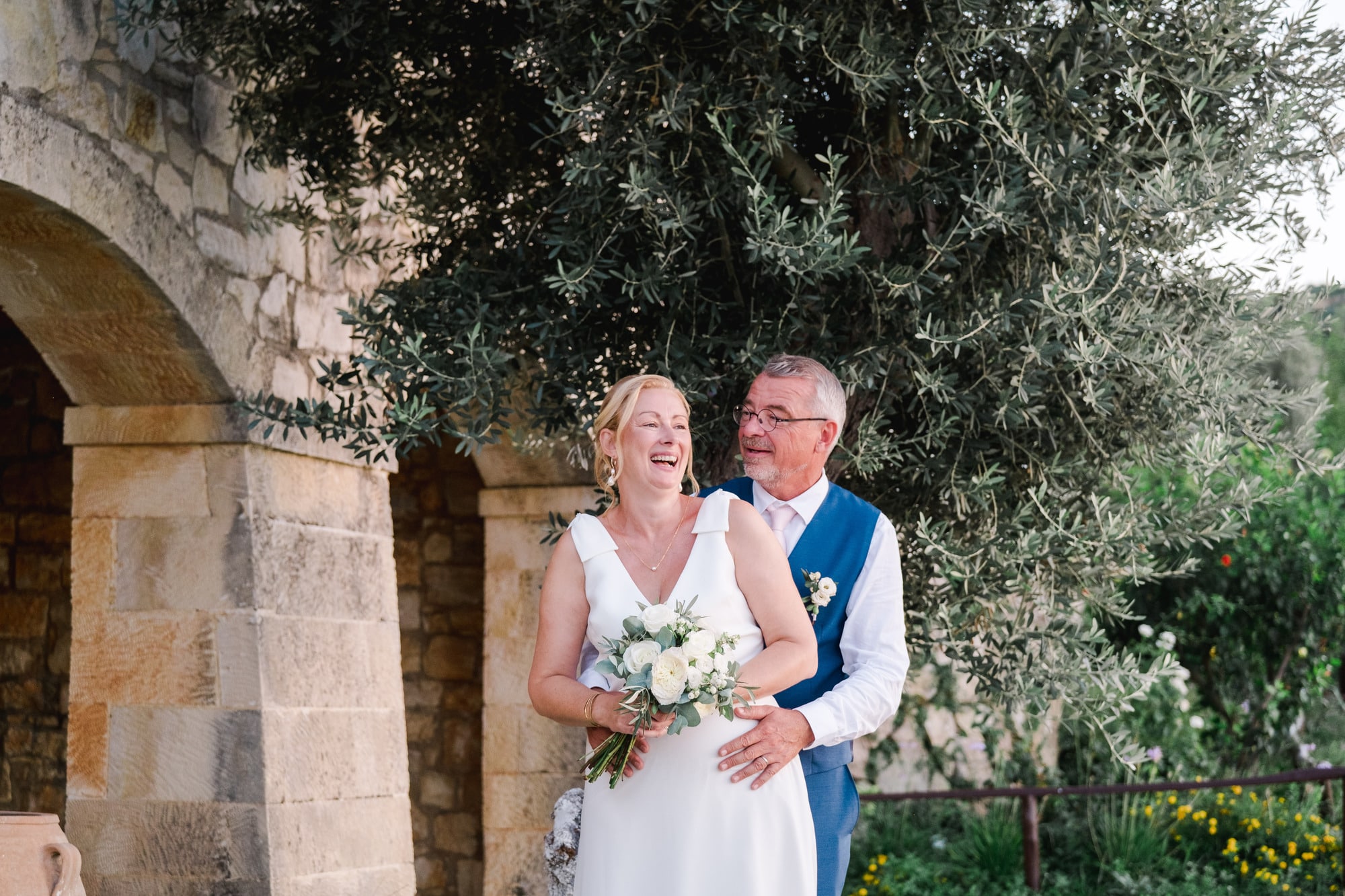 Ce mariage en Crète s’est déroulé à Agreco Farm, près de Rethymnon, dans un cadre authentique mêlant nature, pierre et traditions locales. Entourés d’oliviers et de bâtiments en pierre typiquement crétois, les mariés ont célébré leur union dans une ambiance chaleureuse et conviviale. Après la cérémonie, les invités ont partagé un cocktail puis un dîner en plein air autour de longues tables élégamment décorées de fleurs et de feuillage méditerranéen. À la nuit tombée, les guirlandes lumineuses ont illuminé la réception, laissant place à une soirée festive rythmée par des danses traditionnelles crétoises et des moments de joie spontanés, reflétant l’âme d’un véritable mariage destination en Crète.