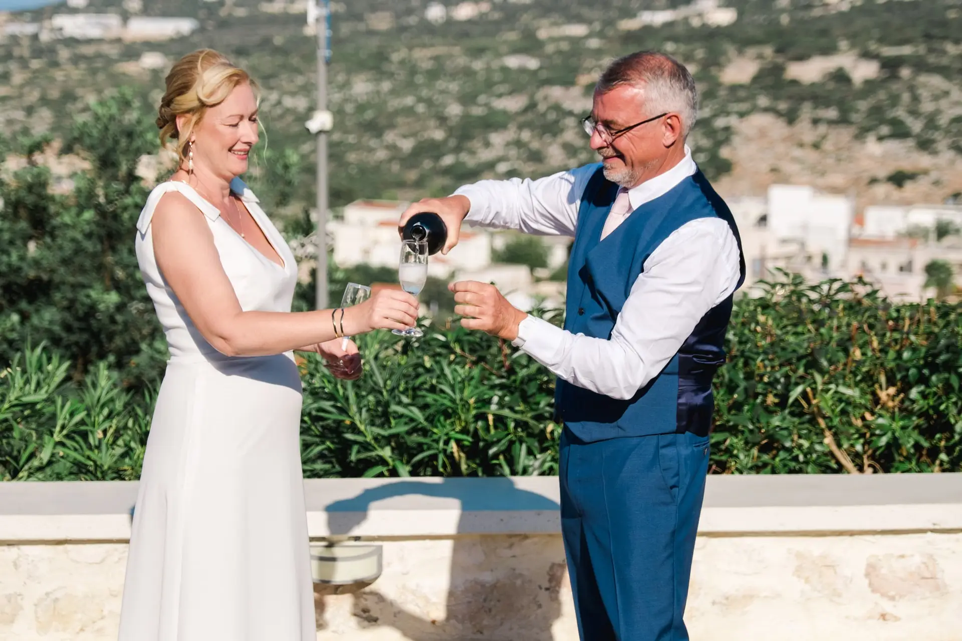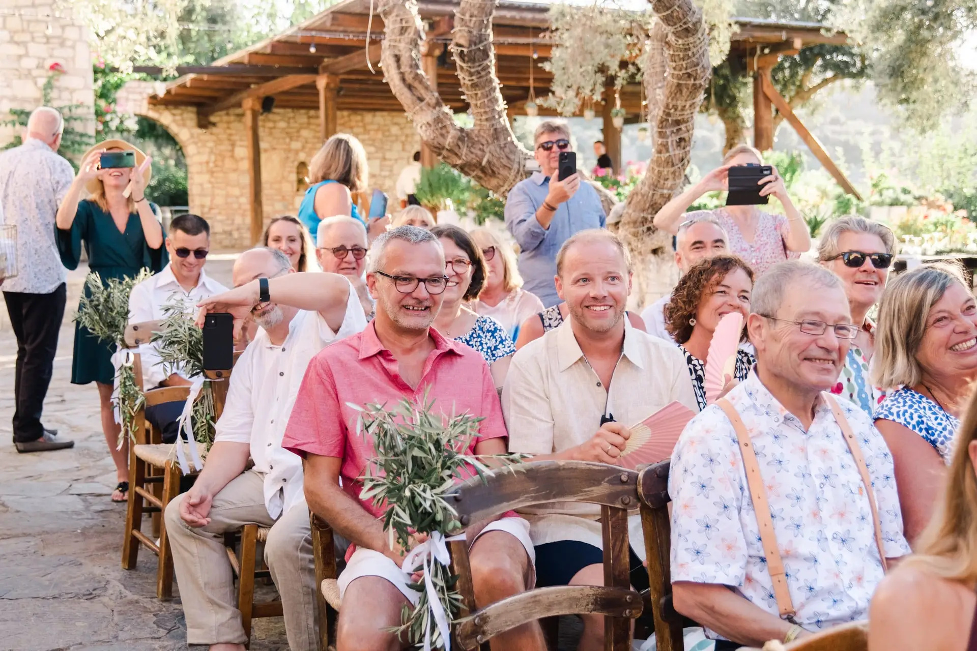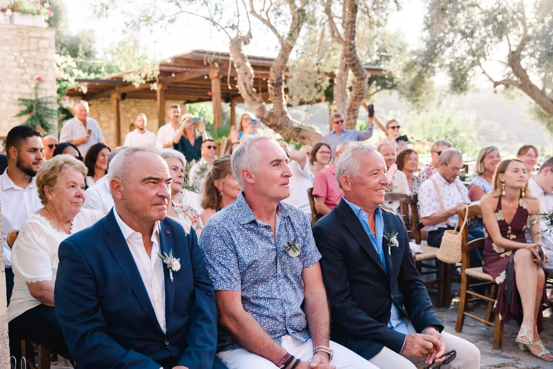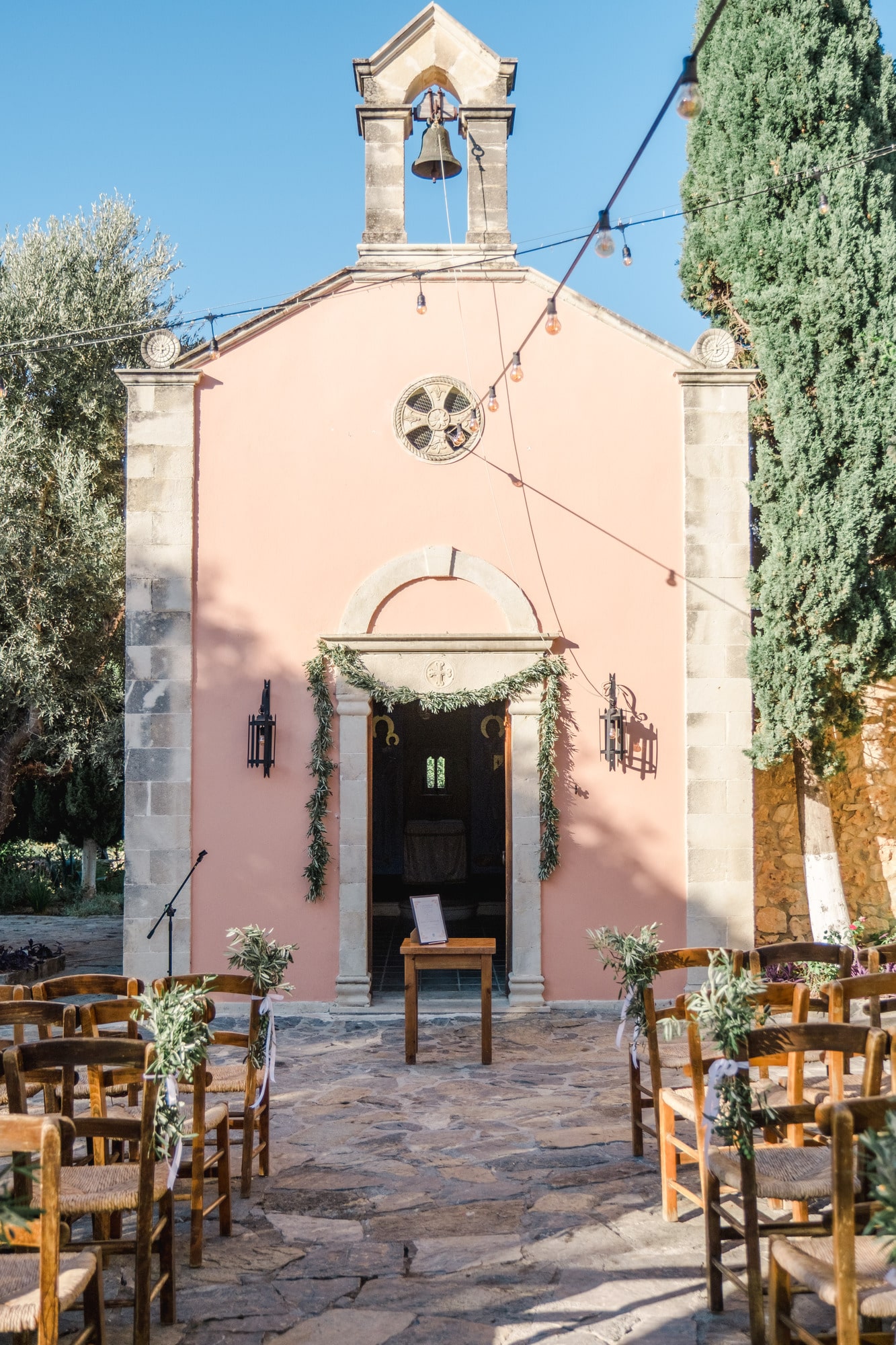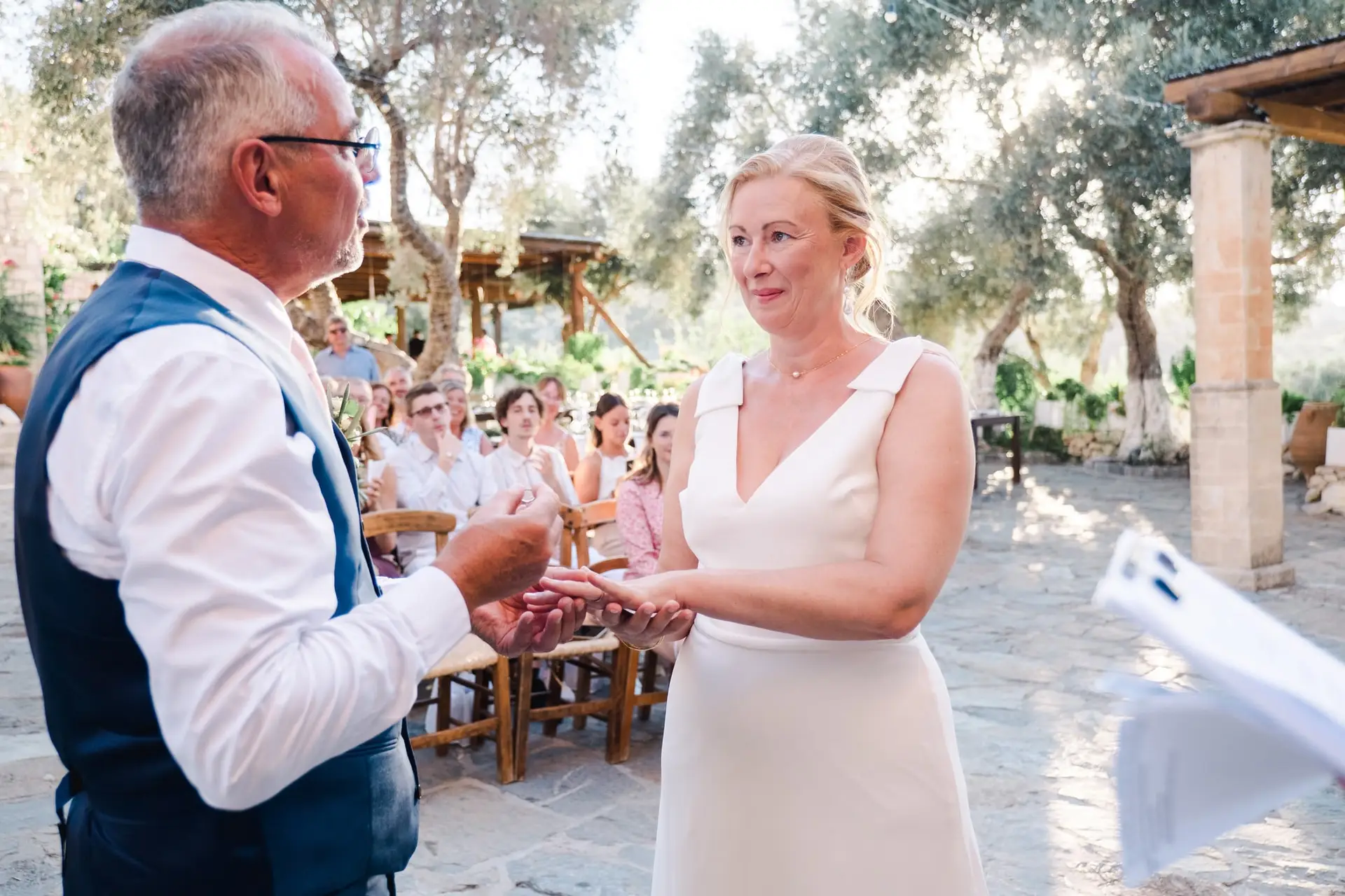 Ce mariage en Crète s’est déroulé à Agreco Farm, près de Rethymnon, dans un cadre authentique mêlant nature, pierre et traditions locales. Entourés d’oliviers et de bâtiments en pierre typiquement crétois, les mariés ont célébré leur union dans une ambiance chaleureuse et conviviale. Après la cérémonie, les invités ont partagé un cocktail puis un dîner en plein air autour de longues tables élégamment décorées de fleurs et de feuillage méditerranéen. À la nuit tombée, les guirlandes lumineuses ont illuminé la réception, laissant place à une soirée festive rythmée par des danses traditionnelles crétoises et des moments de joie spontanés, reflétant l’âme d’un véritable mariage destination en Crète.