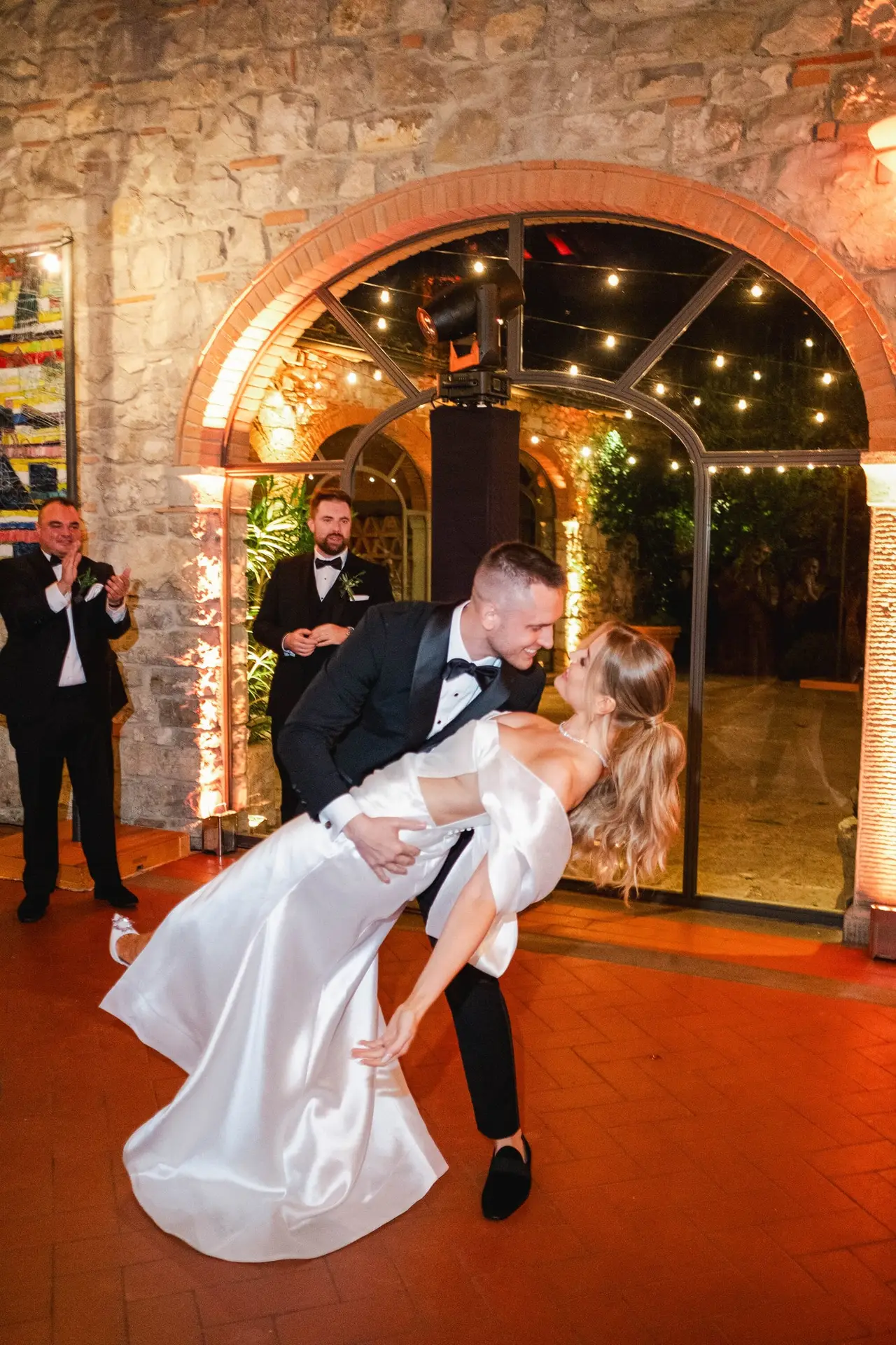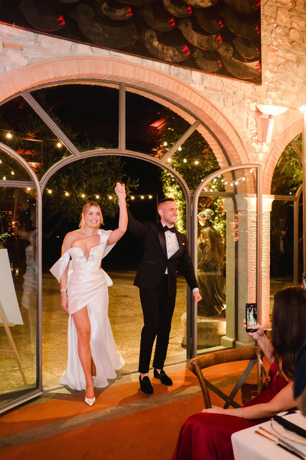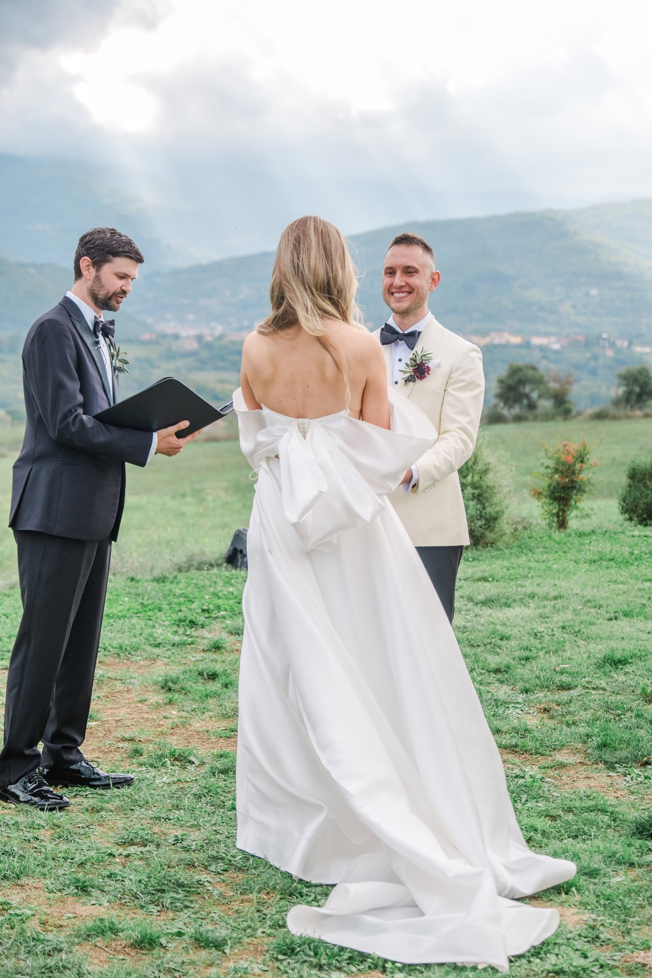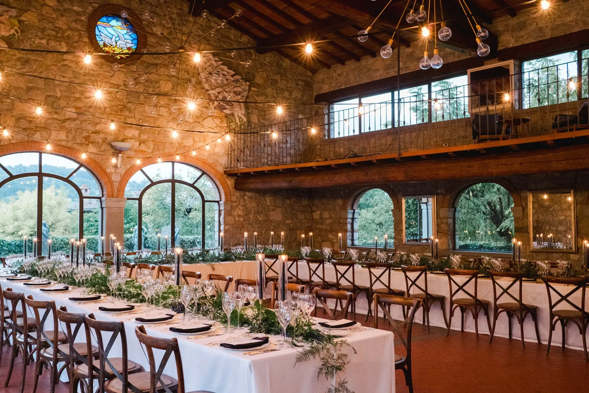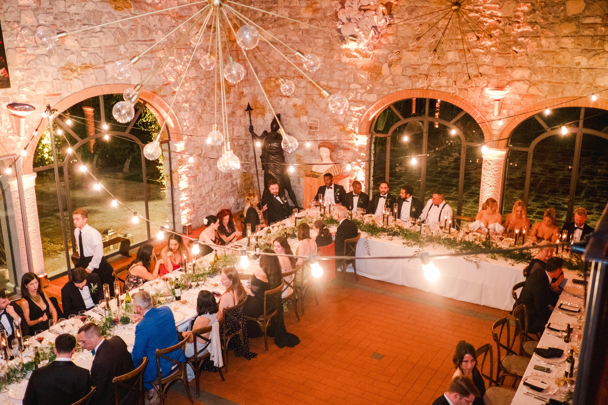 La cérémonie se tient en extérieur, entourée de nature, baignée par une lumière chaleureuse. Le paysage toscan devient le témoin discret de cet engagement. À la tombée du jour, les invités se retrouvent à l’intérieur du borgo, autour de tables soigneusement dressées. Une ambiance conviviale s’installe, faite d’échanges, de rires et de moments partagés, portée par la beauté du lieu et l’émotion du moment.