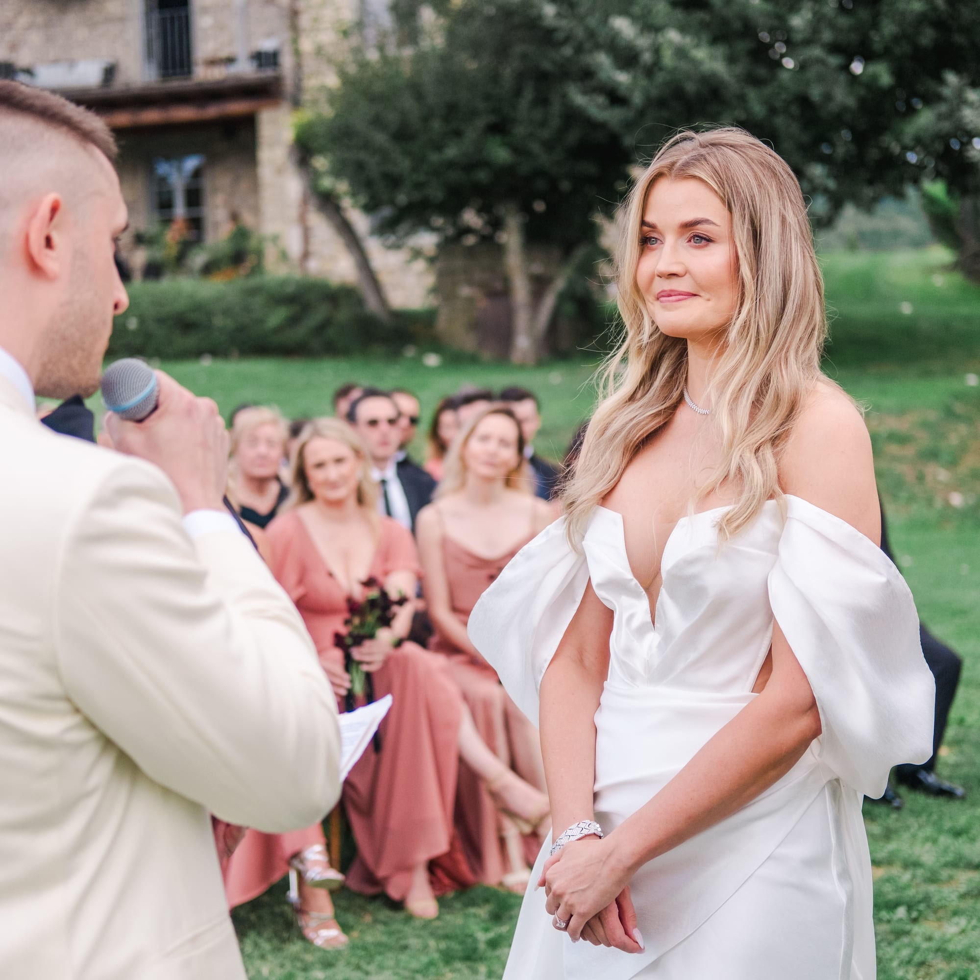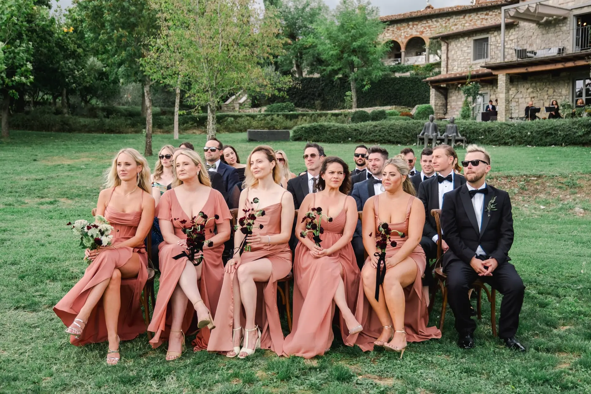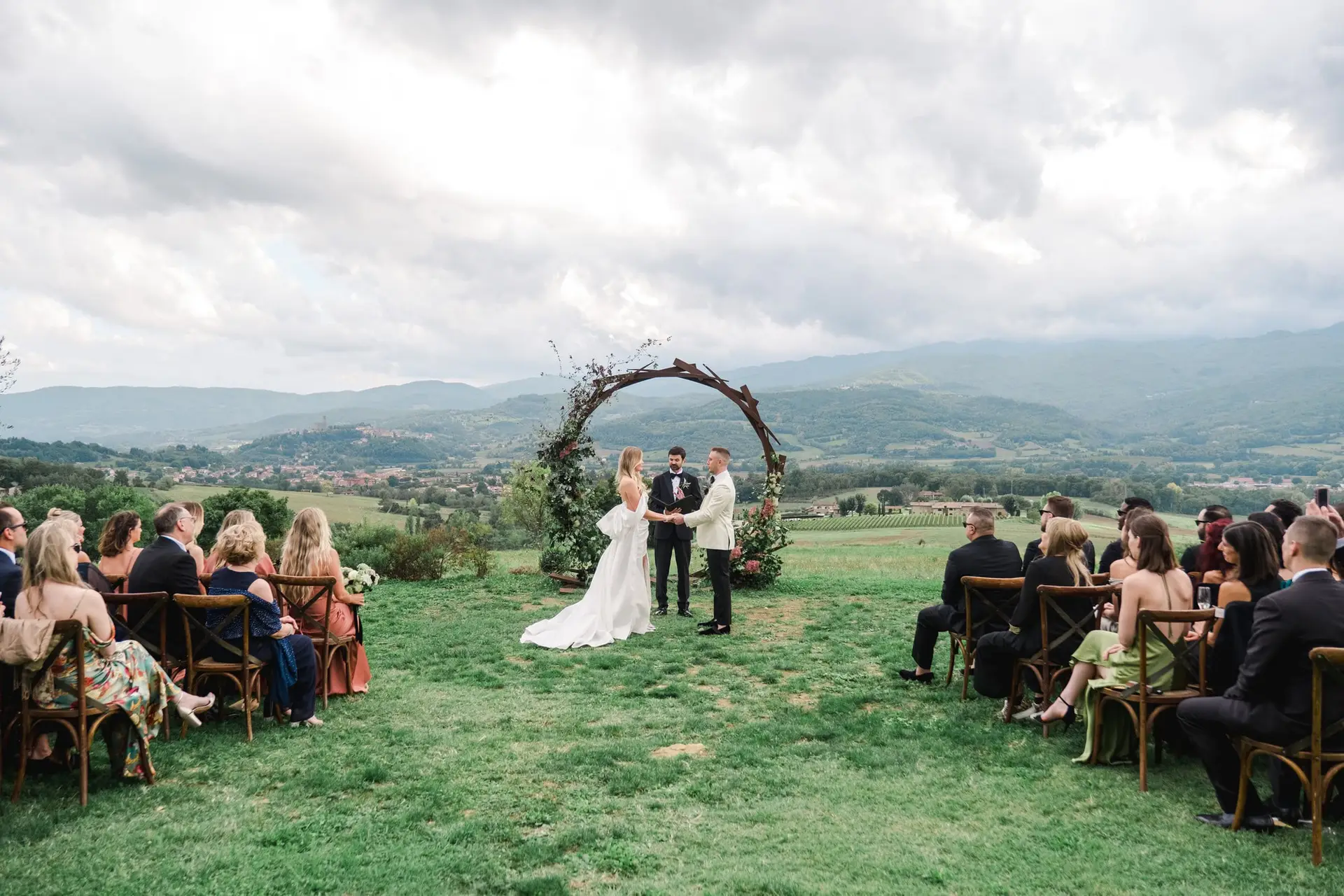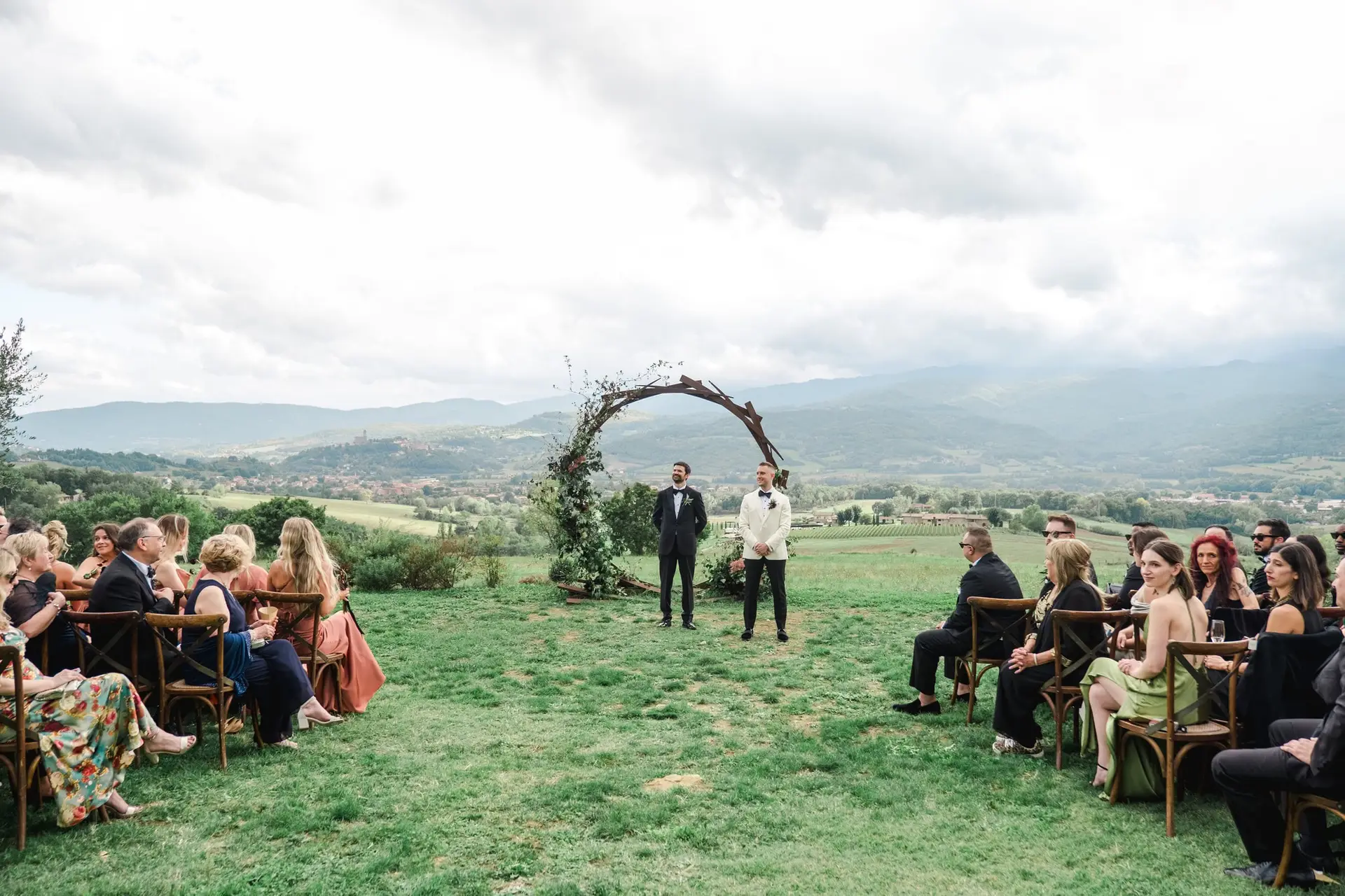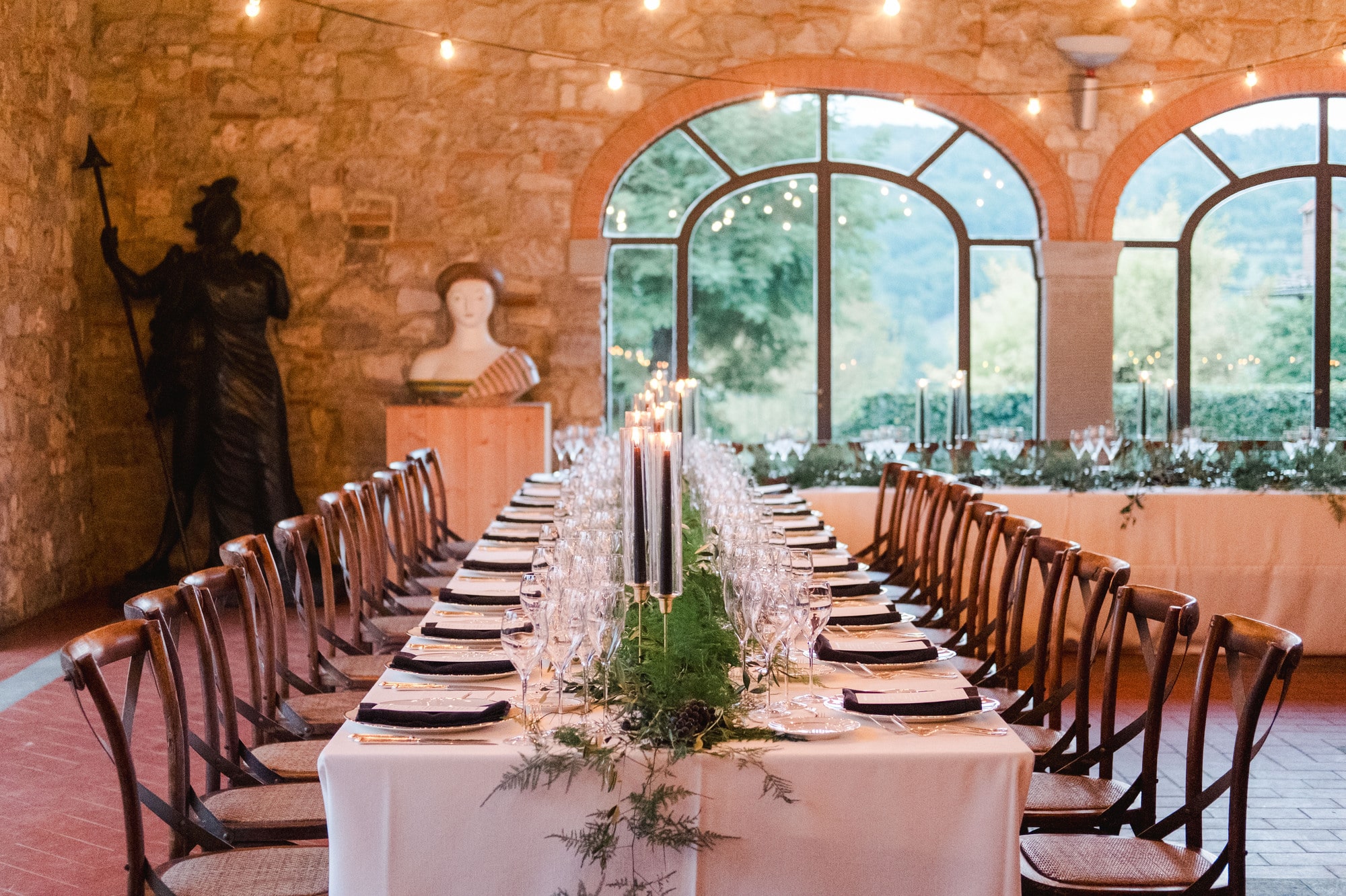 La cérémonie se tient en extérieur, entourée de nature, baignée par une lumière chaleureuse. Le paysage toscan devient le témoin discret de cet engagement. À la tombée du jour, les invités se retrouvent à l’intérieur du borgo, autour de tables soigneusement dressées. Une ambiance conviviale s’installe, faite d’échanges, de rires et de moments partagés, portée par la beauté du lieu et l’émotion du moment.