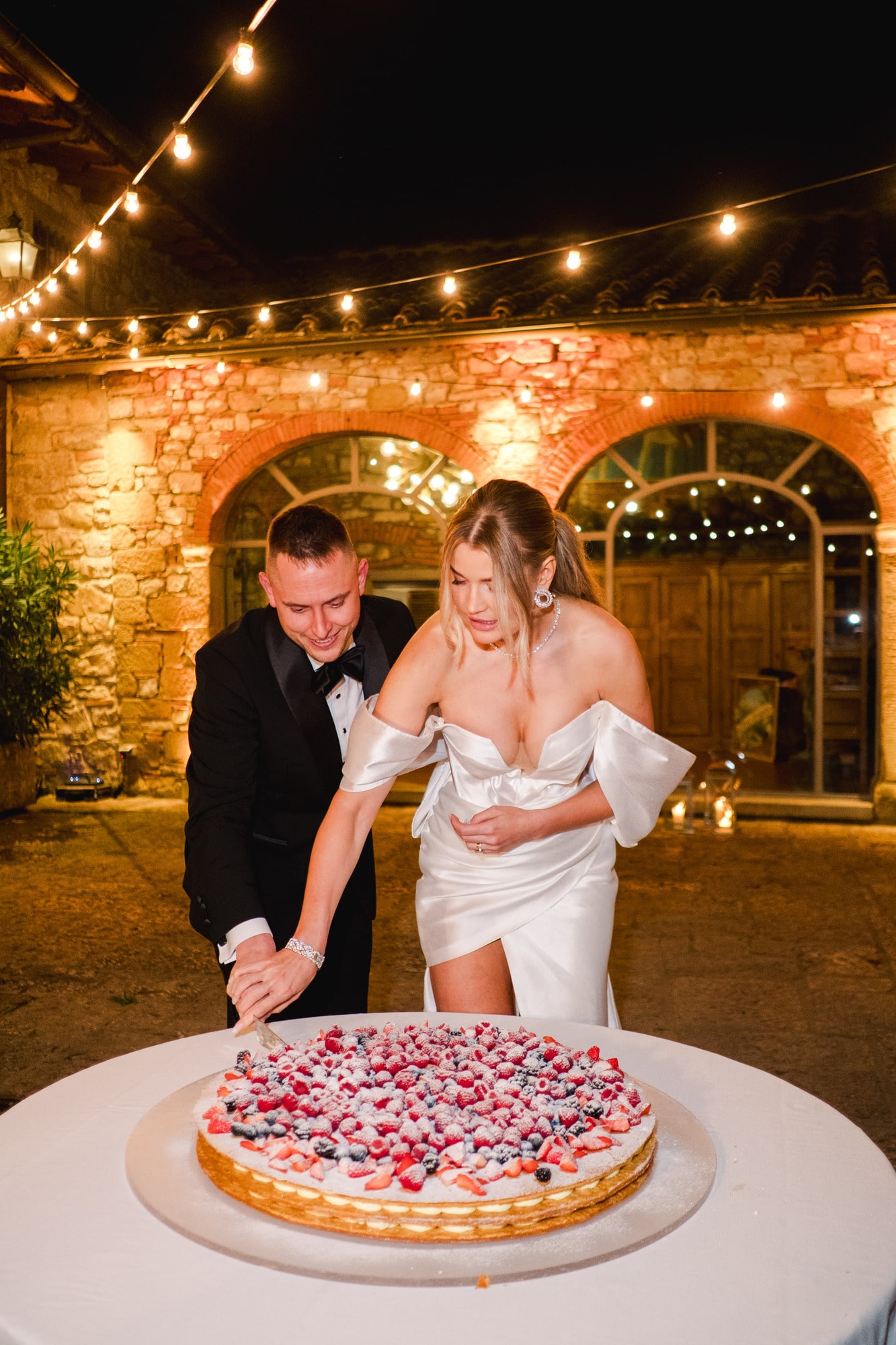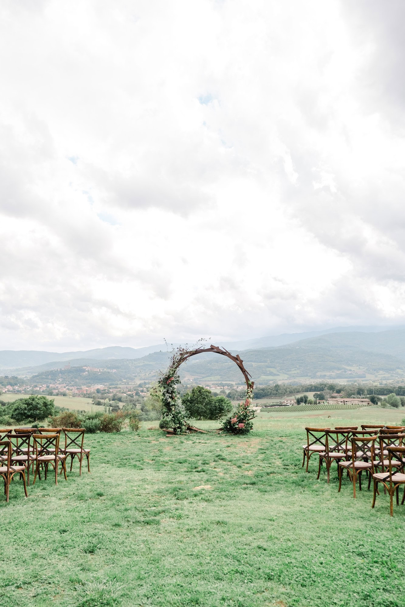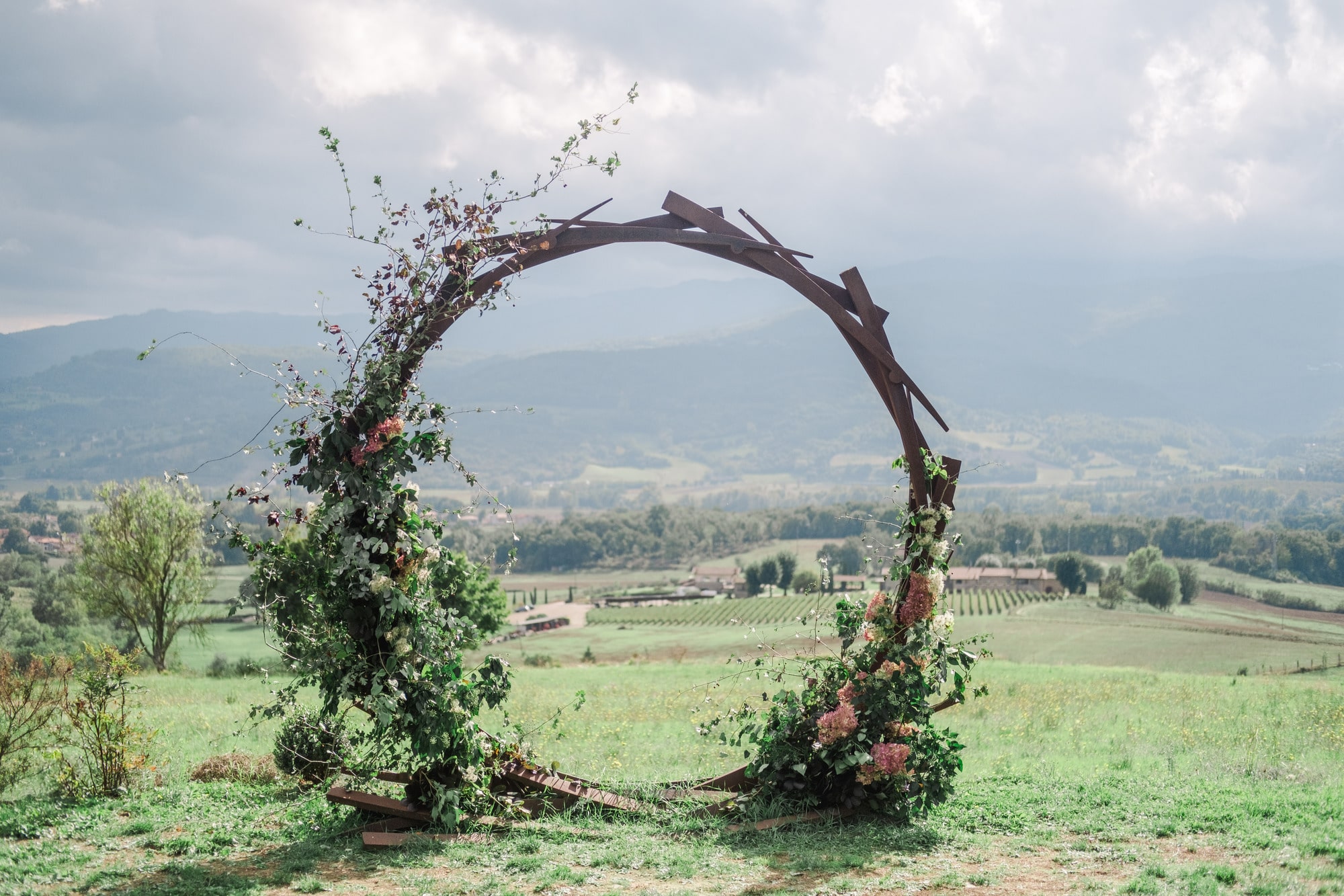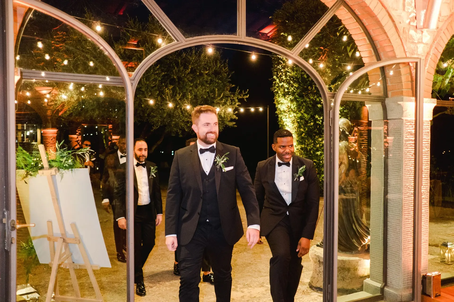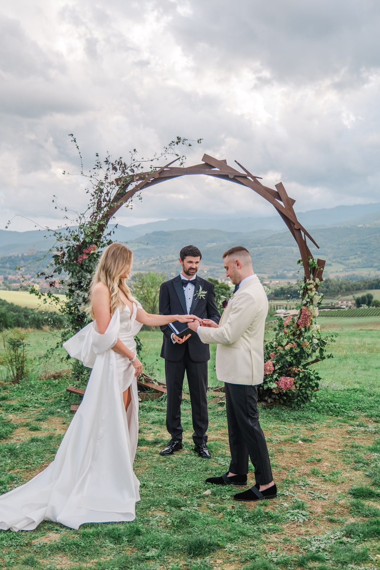 La cérémonie se tient en extérieur, entourée de nature, baignée par une lumière chaleureuse. Le paysage toscan devient le témoin discret de cet engagement. À la tombée du jour, les invités se retrouvent à l’intérieur du borgo, autour de tables soigneusement dressées. Une ambiance conviviale s’installe, faite d’échanges, de rires et de moments partagés, portée par la beauté du lieu et l’émotion du moment.