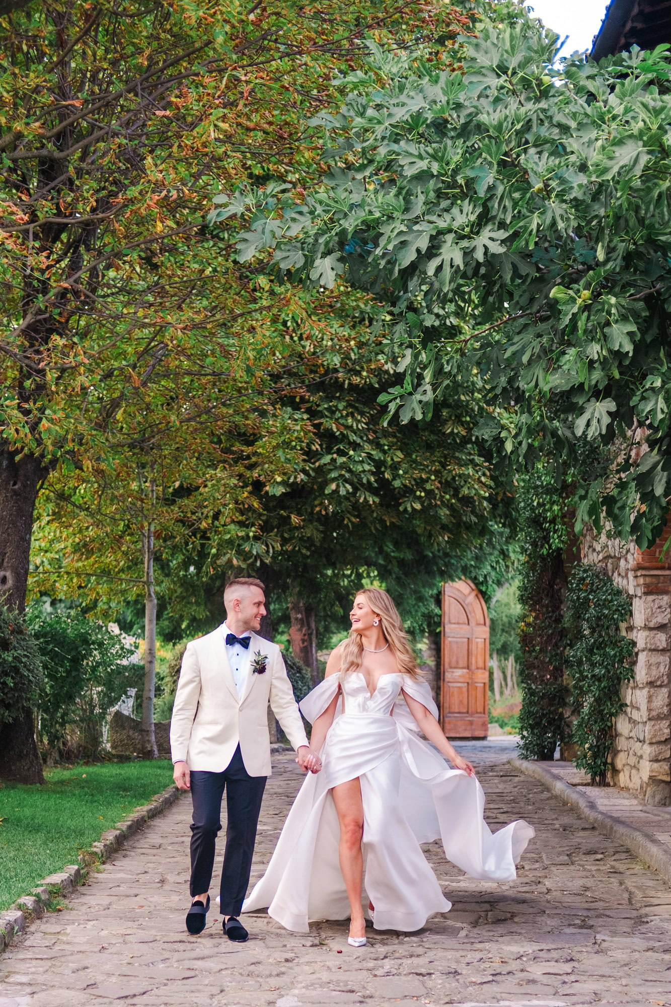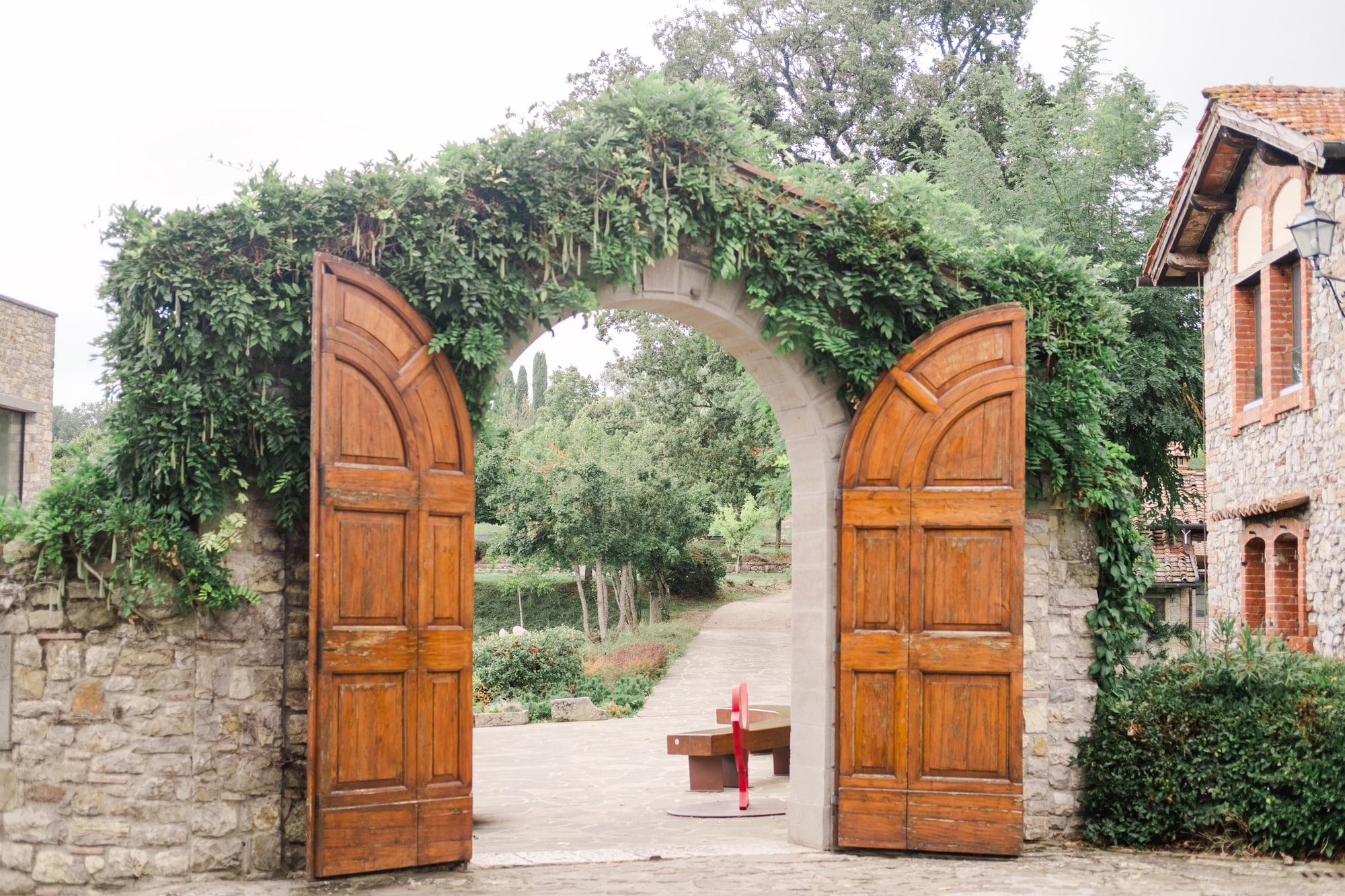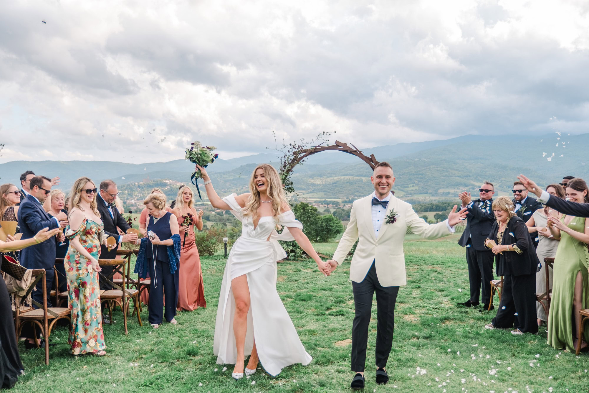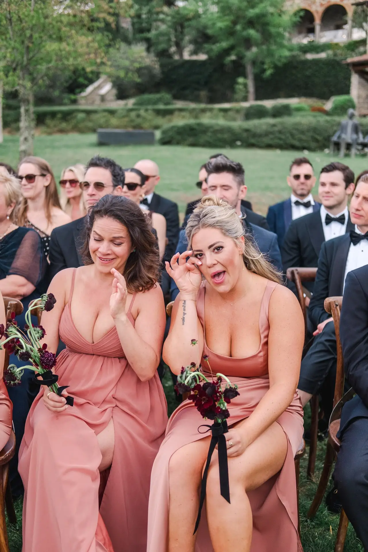 La cérémonie se tient en extérieur, entourée de nature, baignée par une lumière chaleureuse. Le paysage toscan devient le témoin discret de cet engagement. À la tombée du jour, les invités se retrouvent à l’intérieur du borgo, autour de tables soigneusement dressées. Une ambiance conviviale s’installe, faite d’échanges, de rires et de moments partagés, portée par la beauté du lieu et l’émotion du moment.