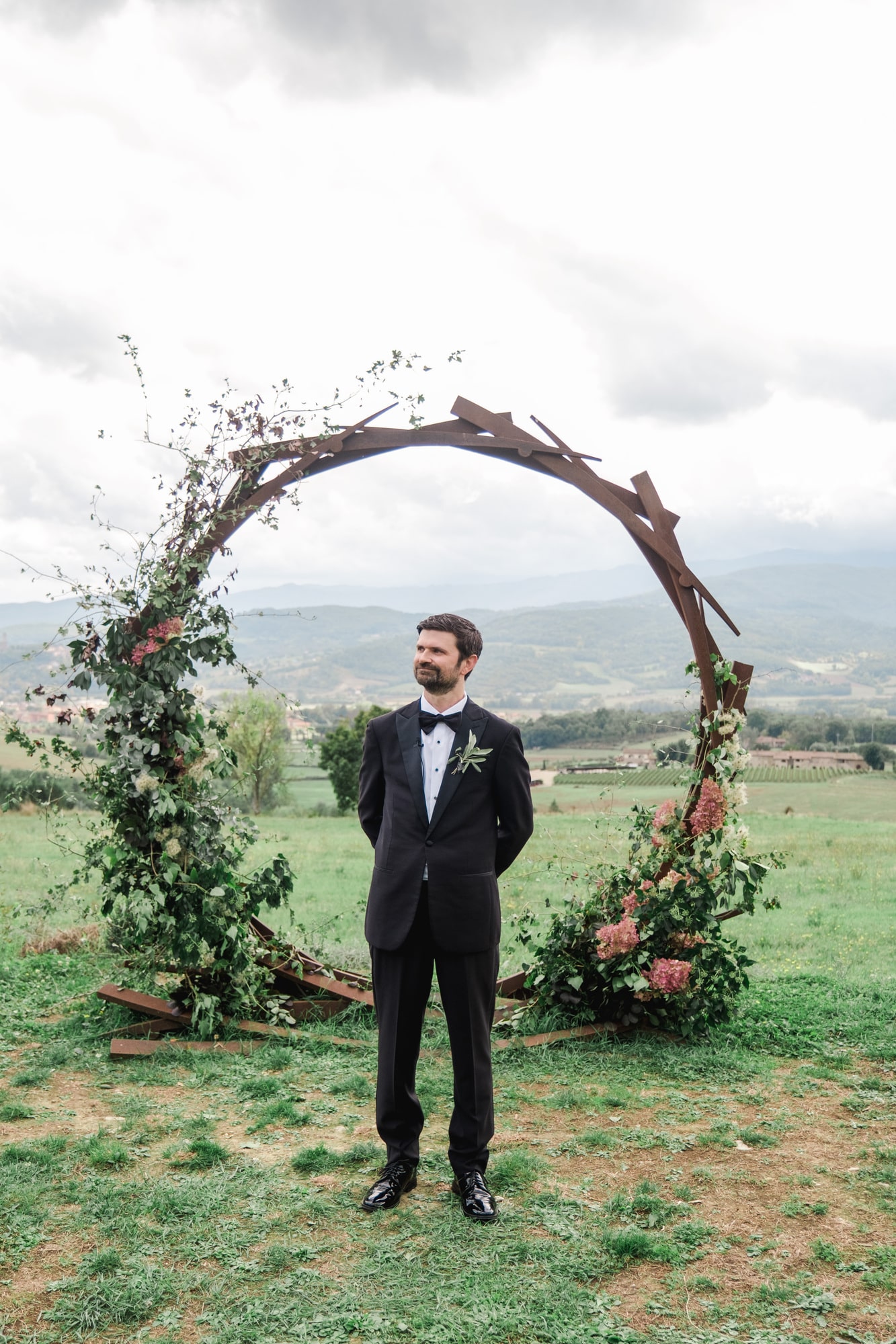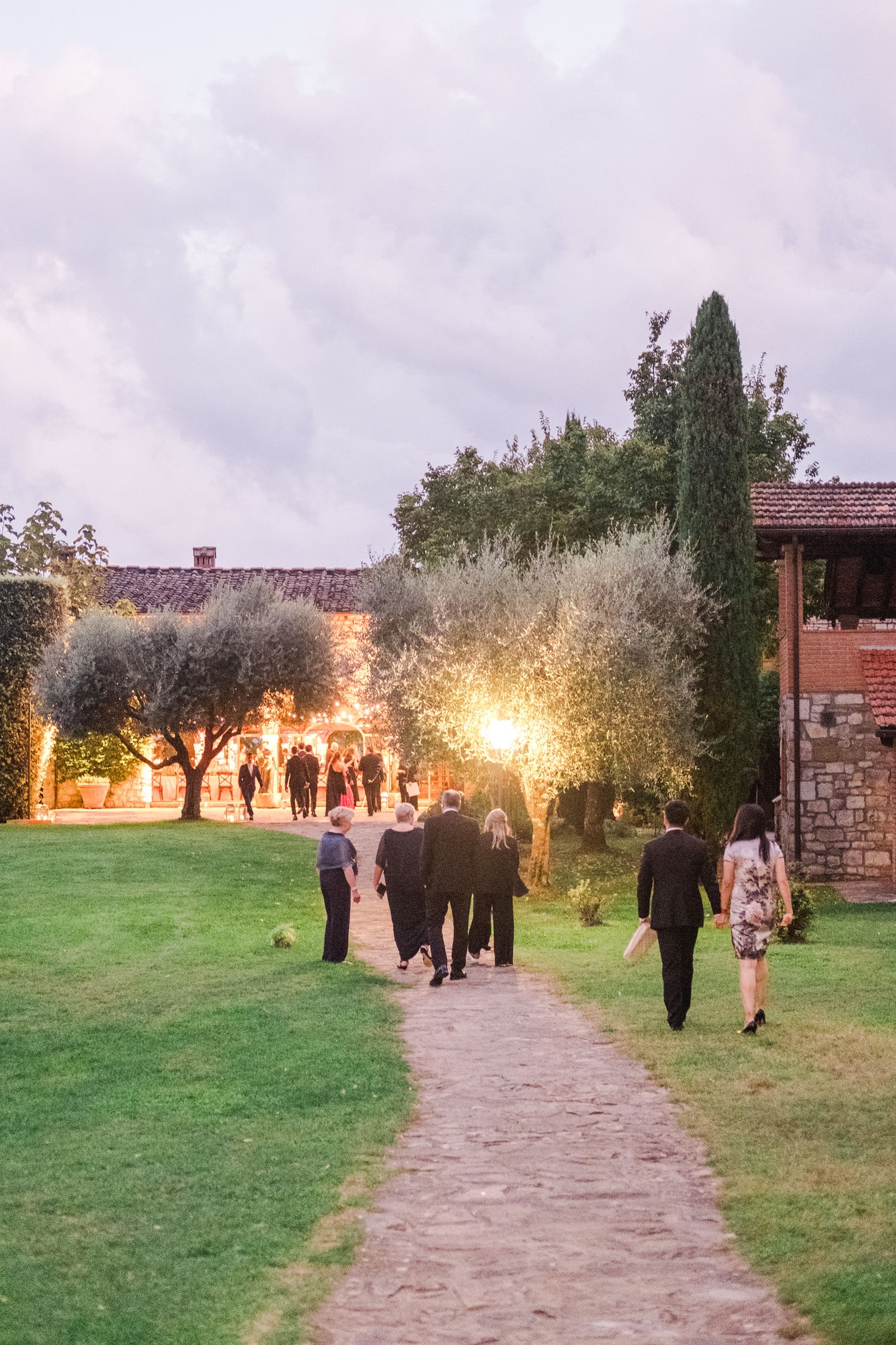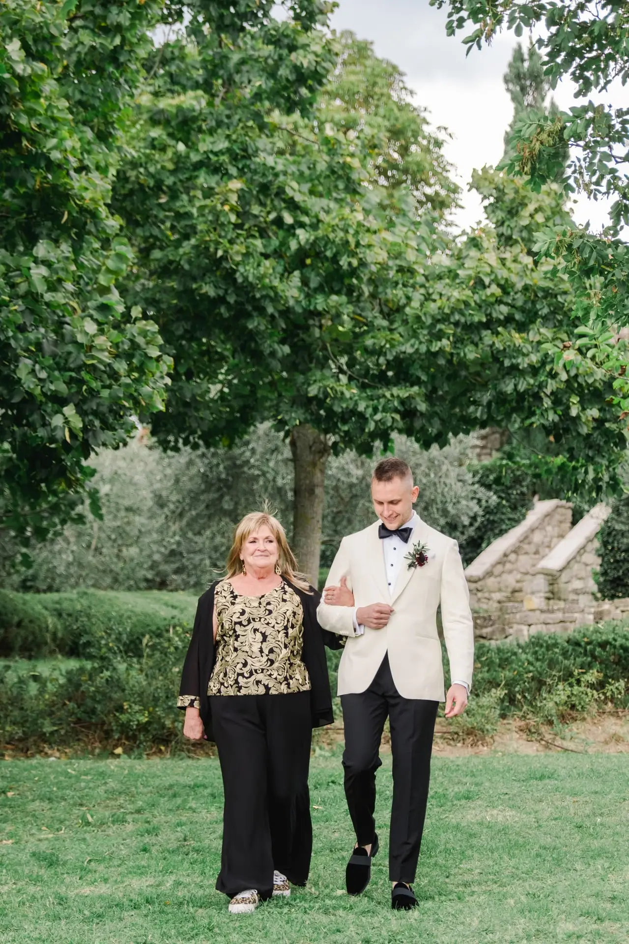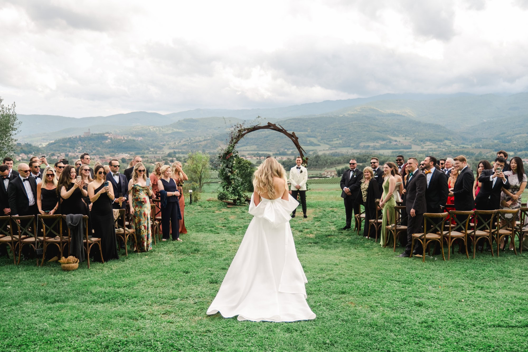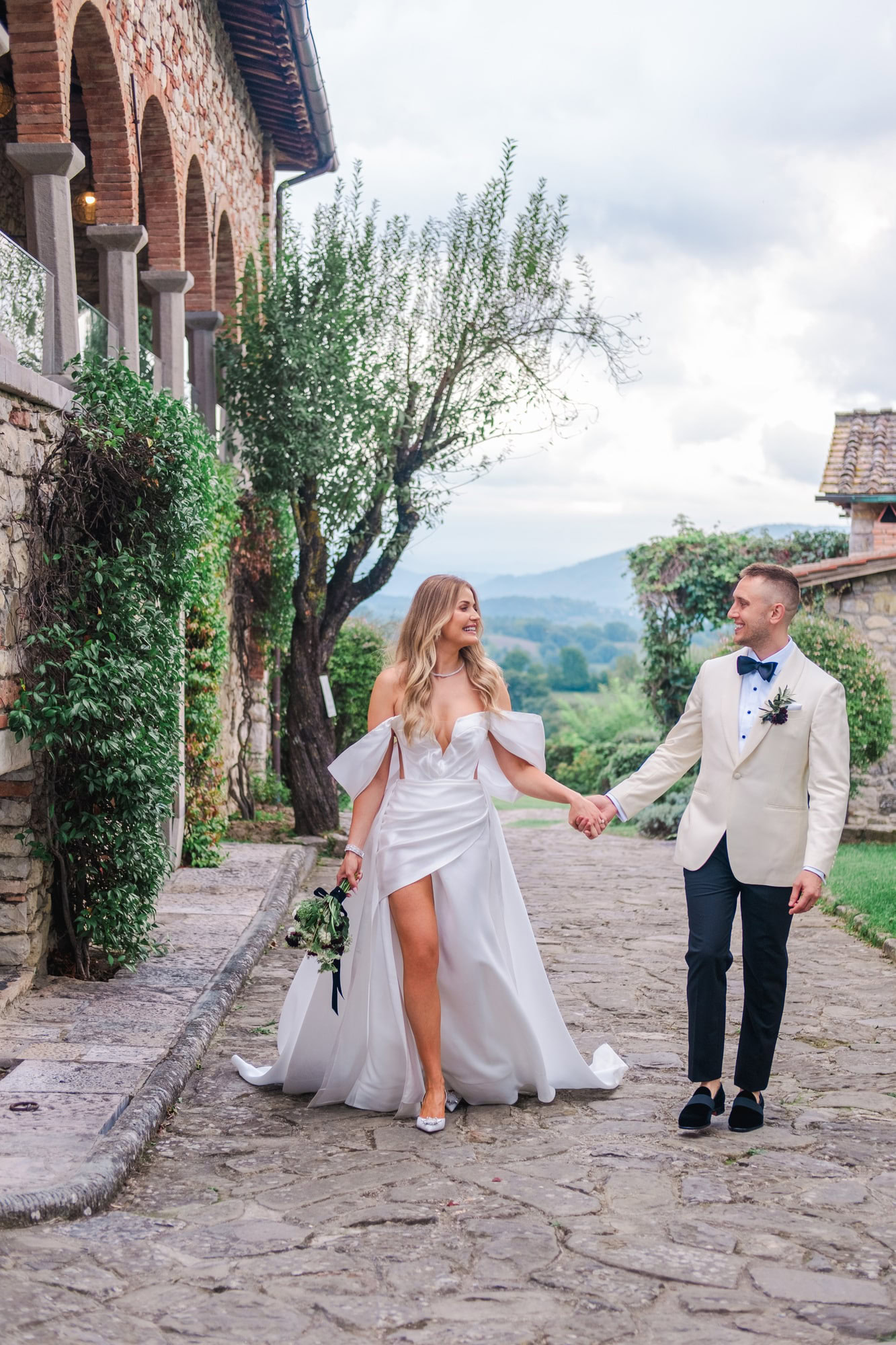 La cérémonie se tient en extérieur, entourée de nature, baignée par une lumière chaleureuse. Le paysage toscan devient le témoin discret de cet engagement. À la tombée du jour, les invités se retrouvent à l’intérieur du borgo, autour de tables soigneusement dressées. Une ambiance conviviale s’installe, faite d’échanges, de rires et de moments partagés, portée par la beauté du lieu et l’émotion du moment.