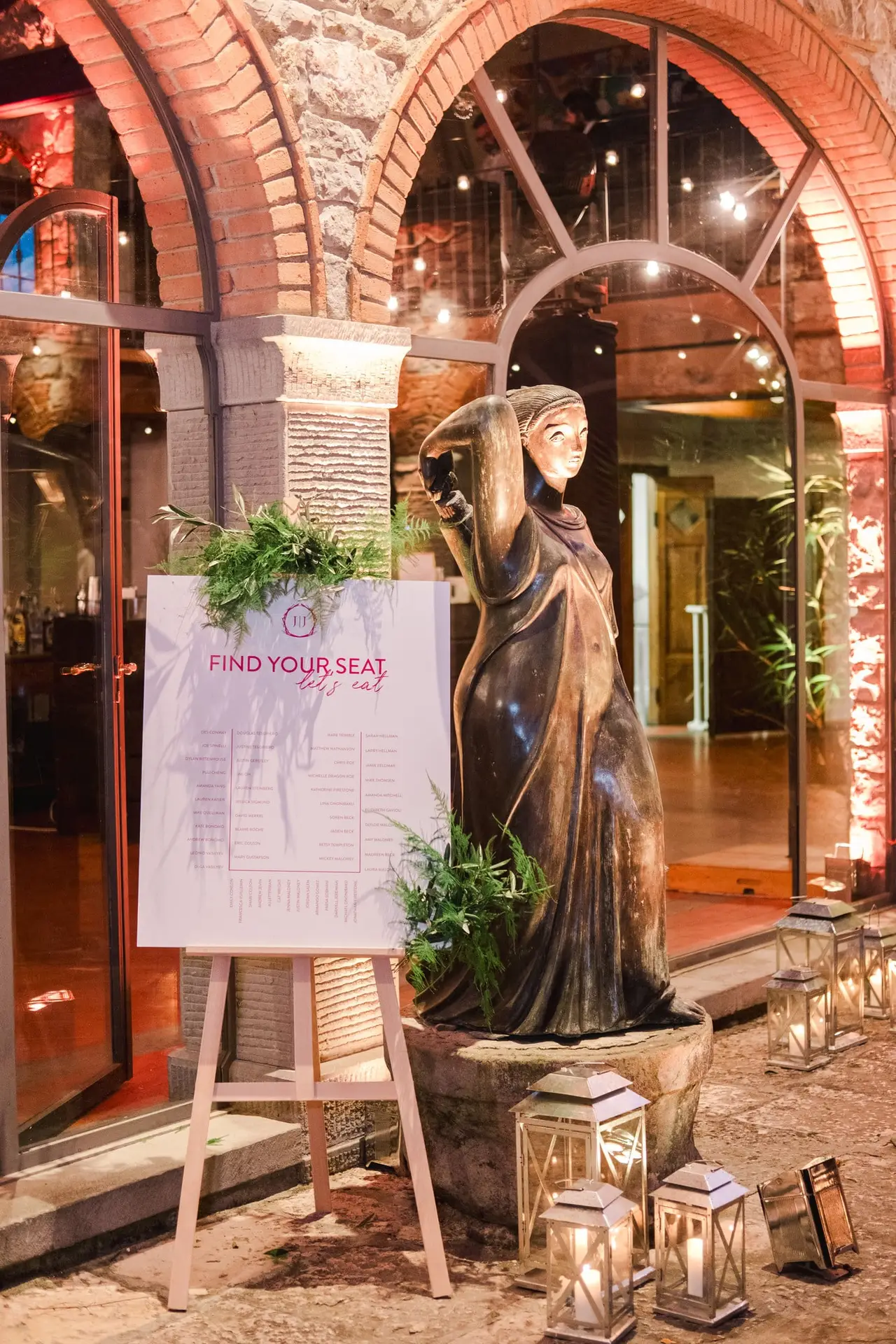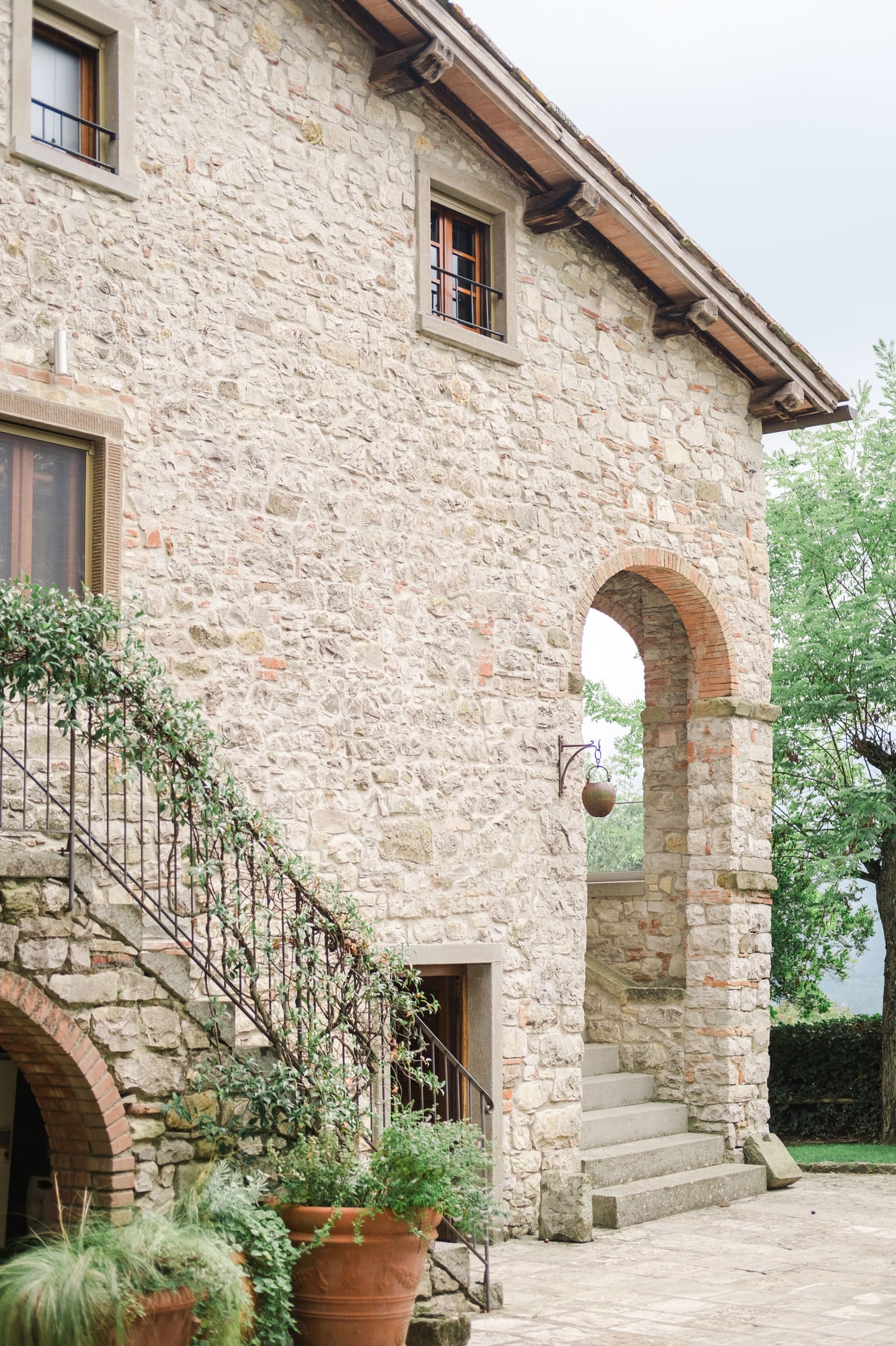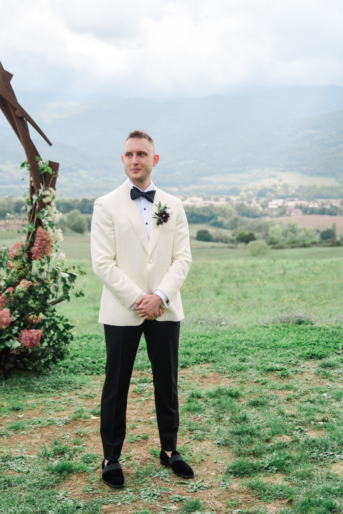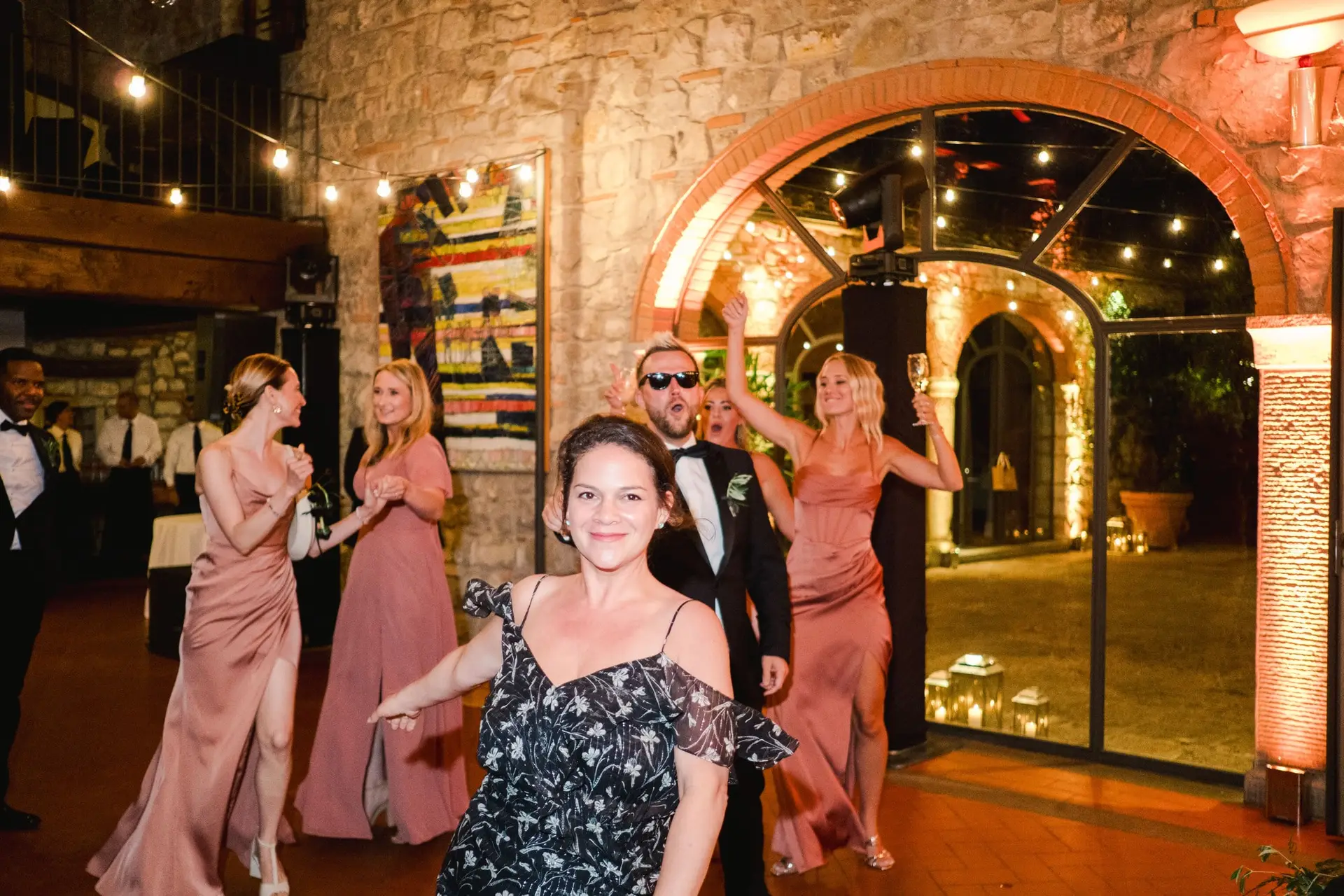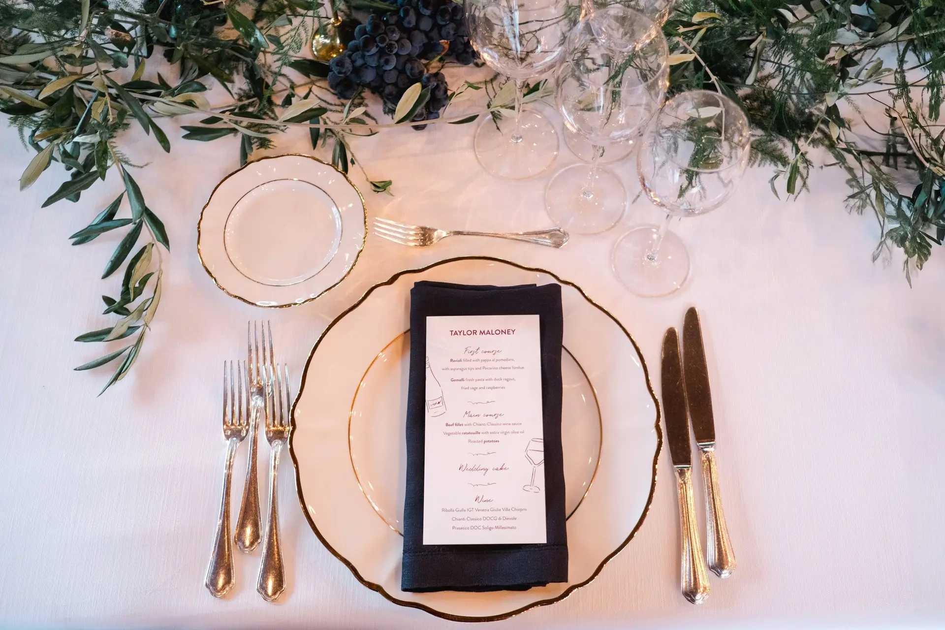La cérémonie se tient en extérieur, entourée de nature, baignée par une lumière chaleureuse. Le paysage toscan devient le témoin discret de cet engagement. À la tombée du jour, les invités se retrouvent à l’intérieur du borgo, autour de tables soigneusement dressées. Une ambiance conviviale s’installe, faite d’échanges, de rires et de moments partagés, portée par la beauté du lieu et l’émotion du moment.
