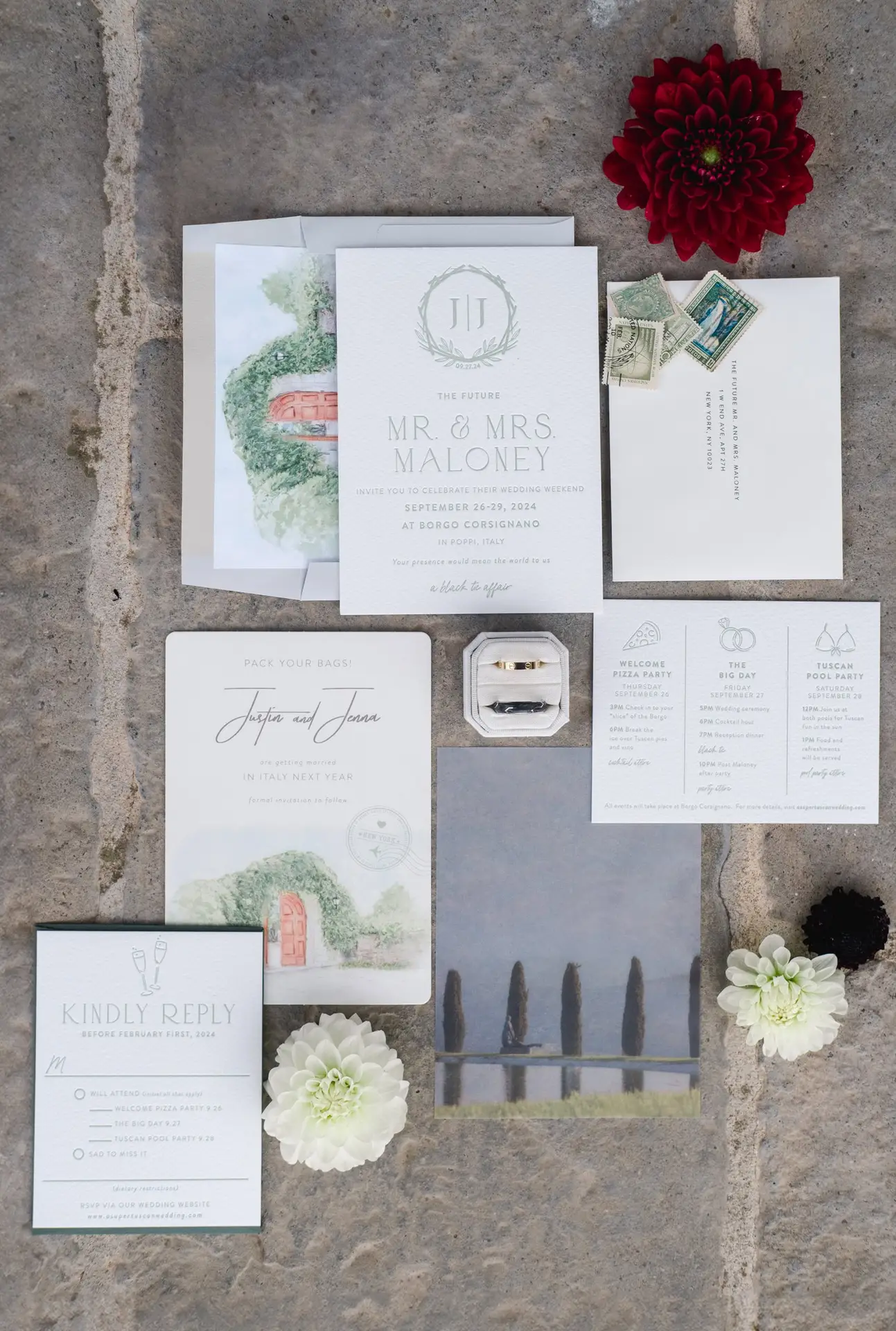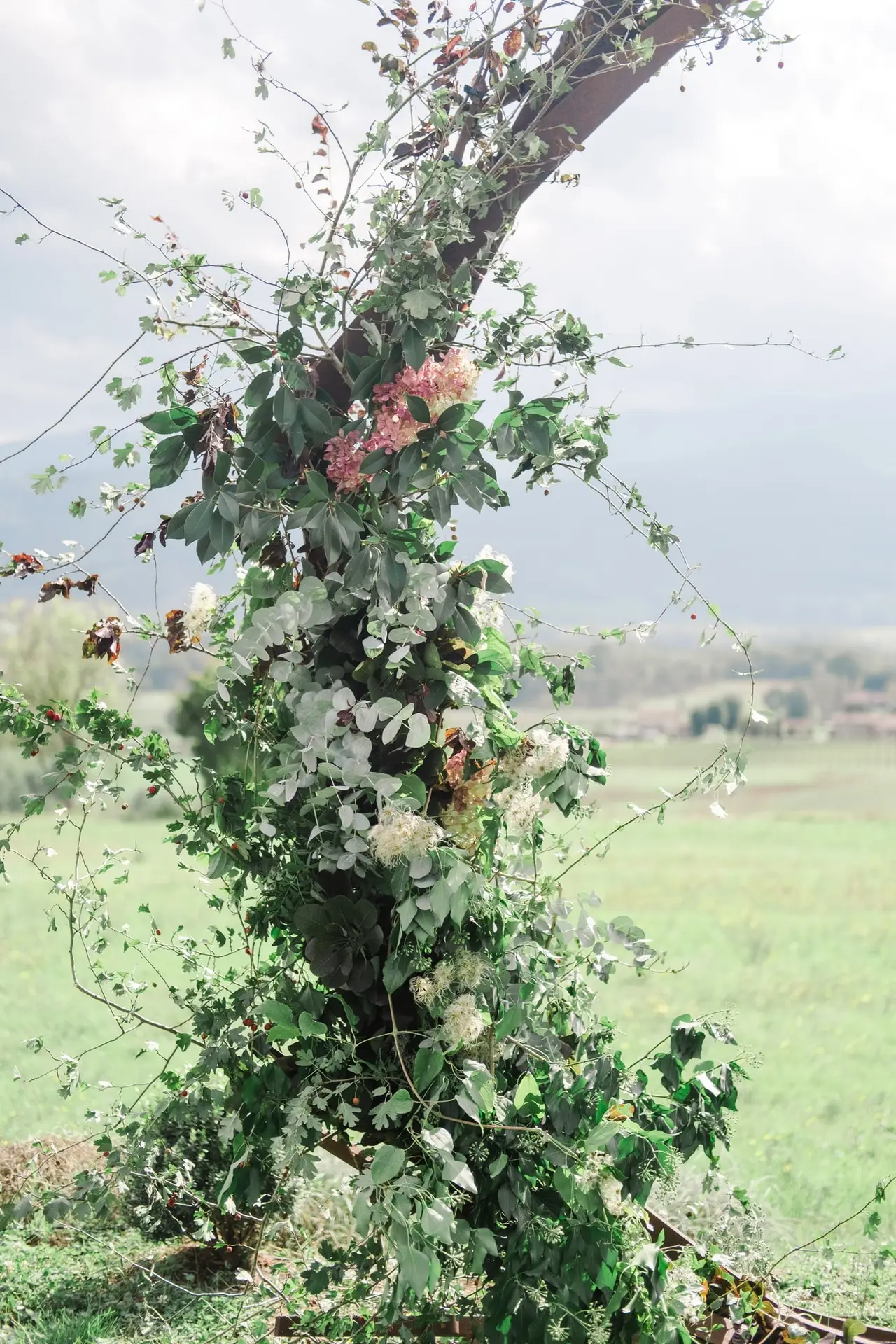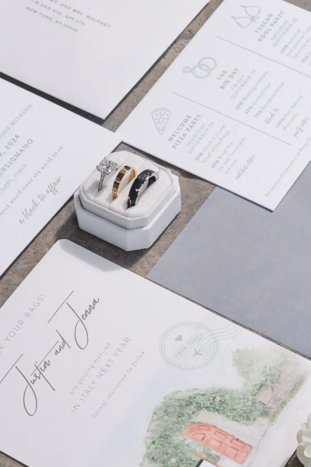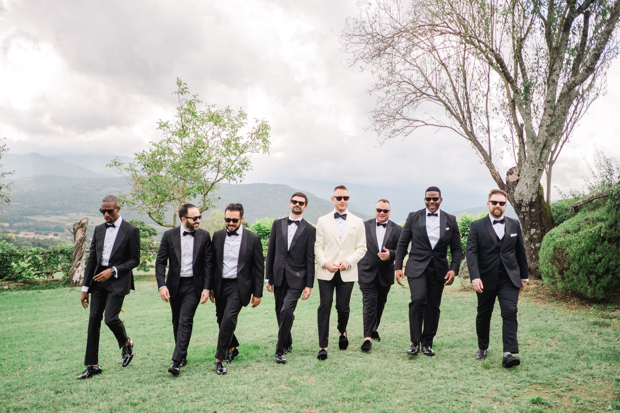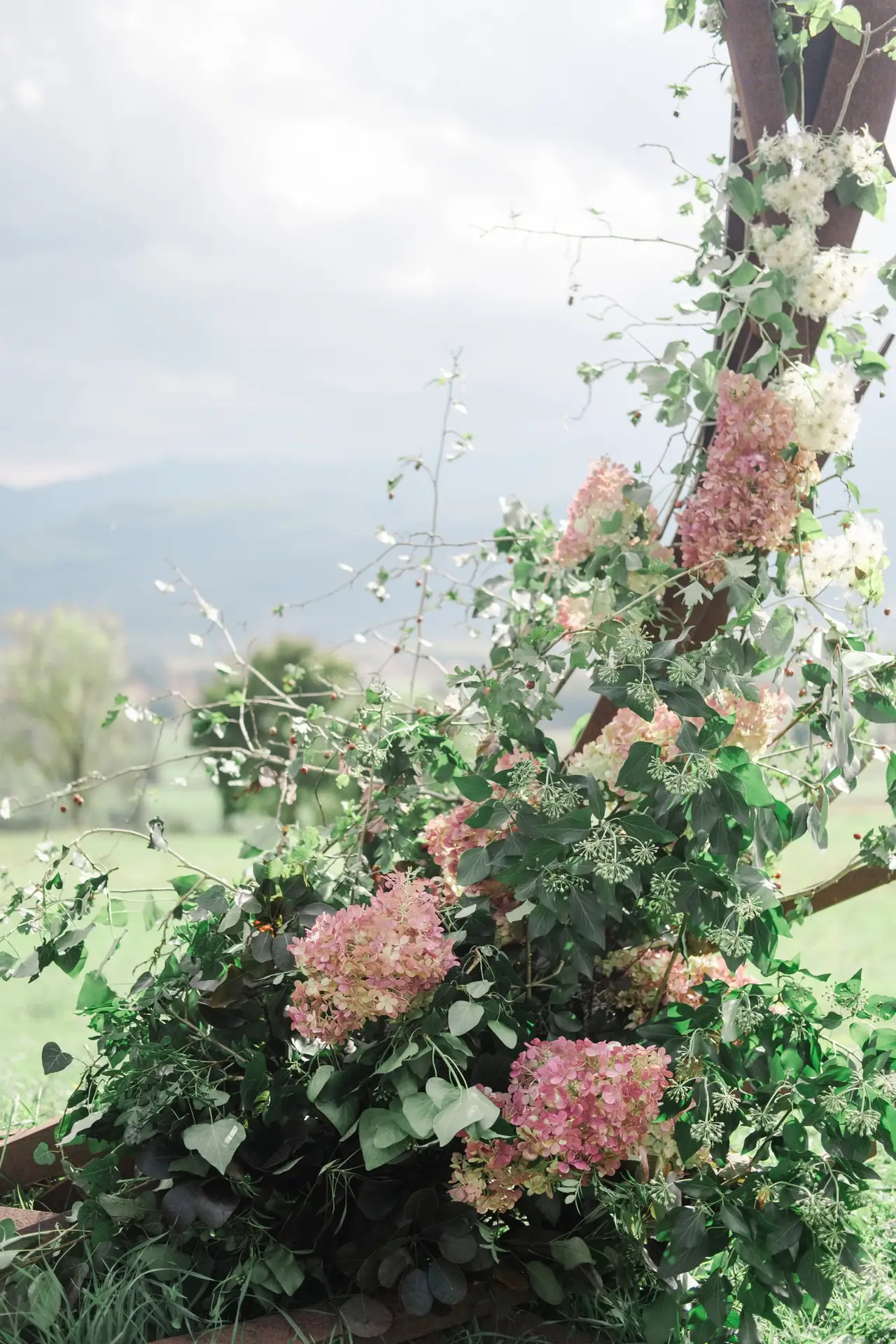 La cérémonie se tient en extérieur, entourée de nature, baignée par une lumière chaleureuse. Le paysage toscan devient le témoin discret de cet engagement. À la tombée du jour, les invités se retrouvent à l’intérieur du borgo, autour de tables soigneusement dressées. Une ambiance conviviale s’installe, faite d’échanges, de rires et de moments partagés, portée par la beauté du lieu et l’émotion du moment.