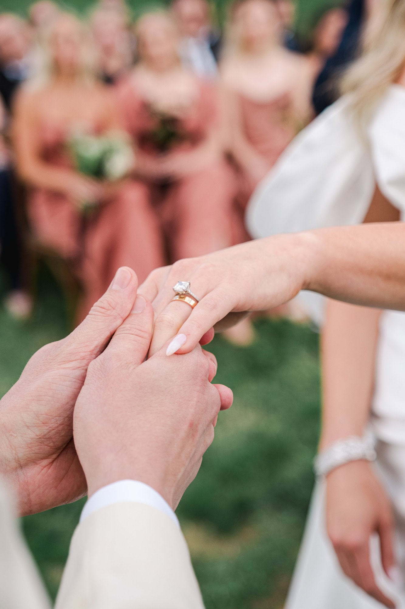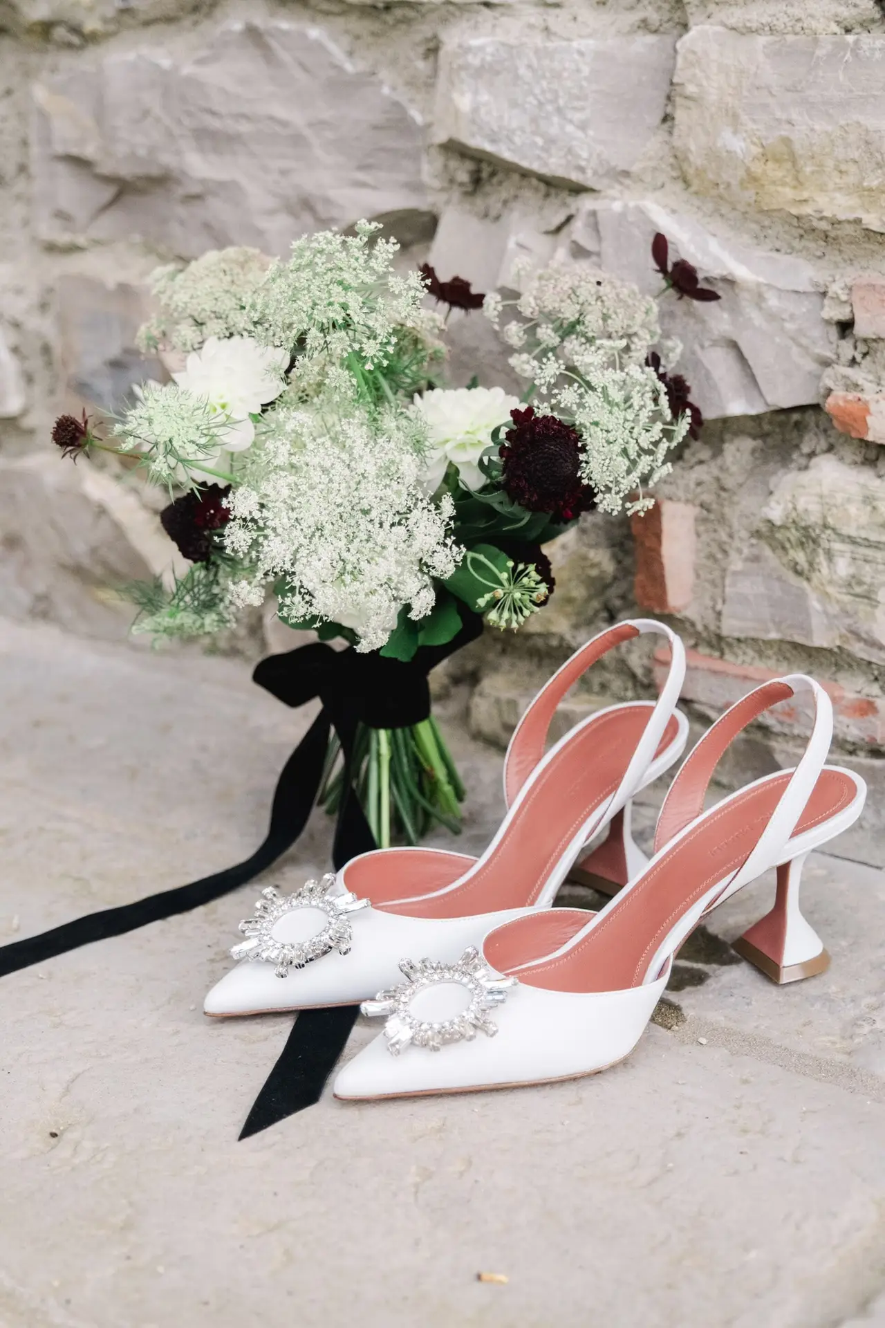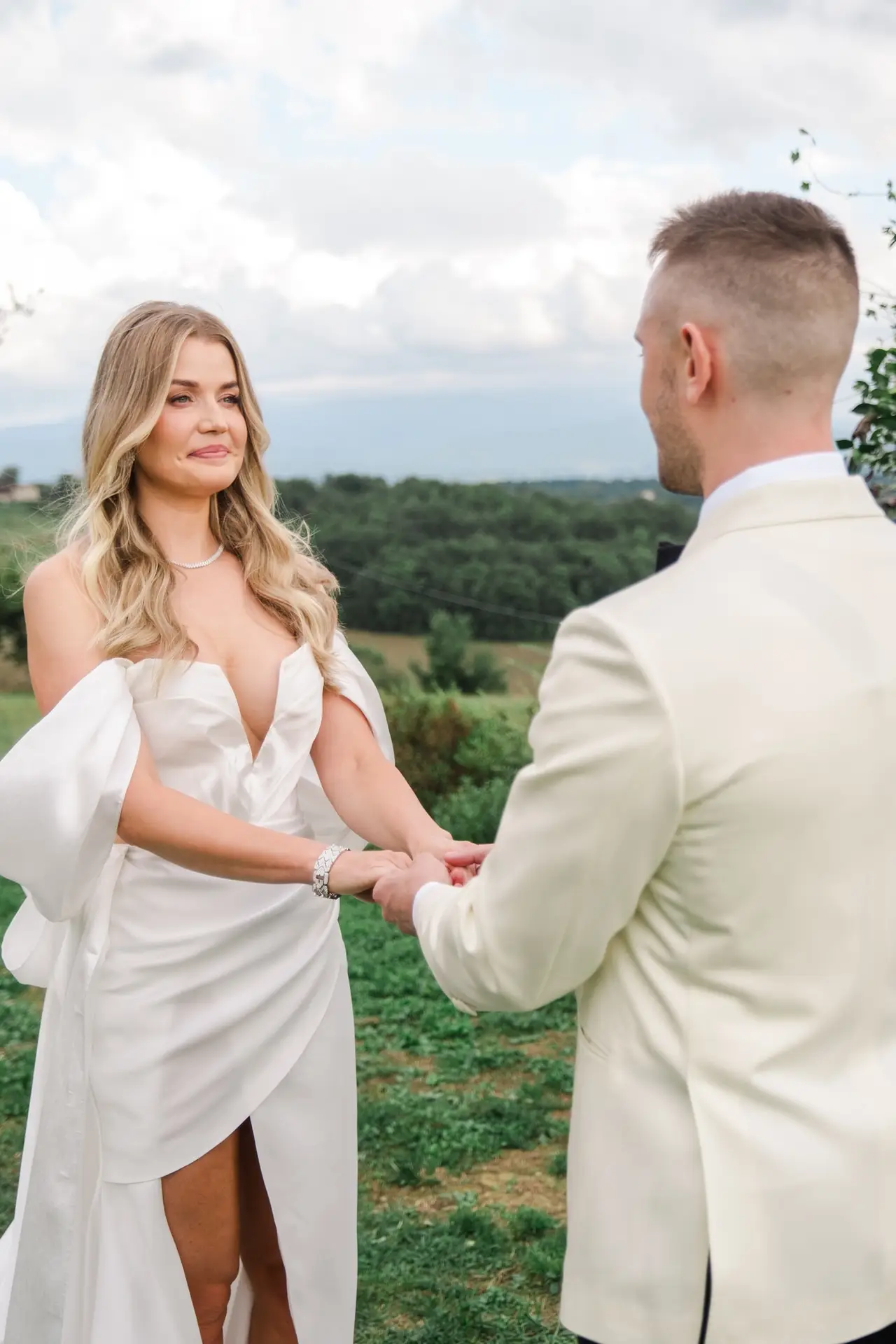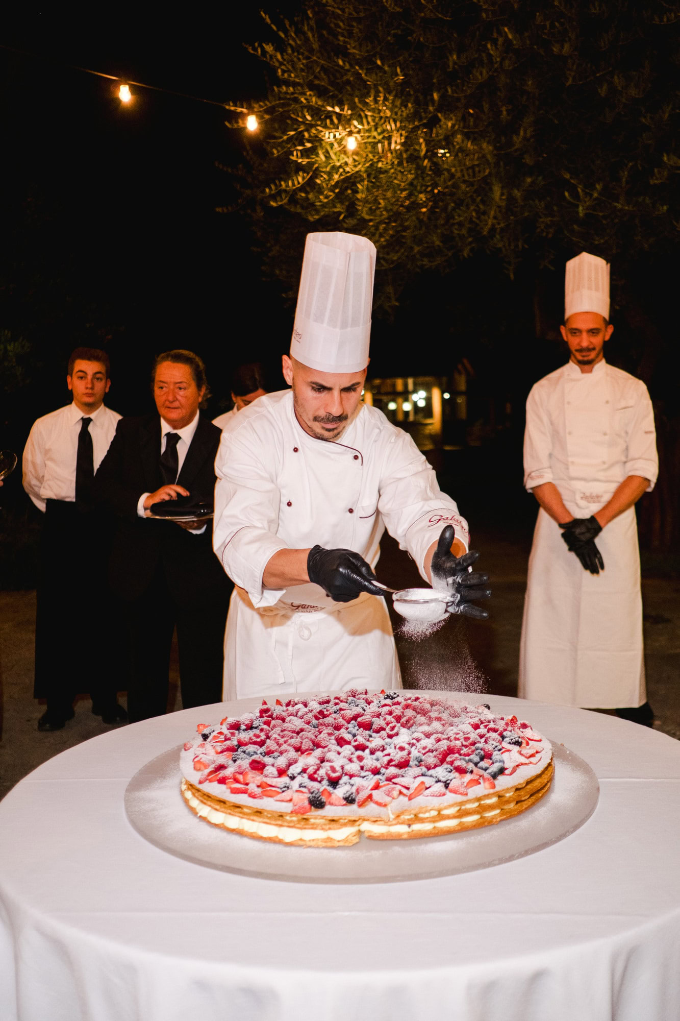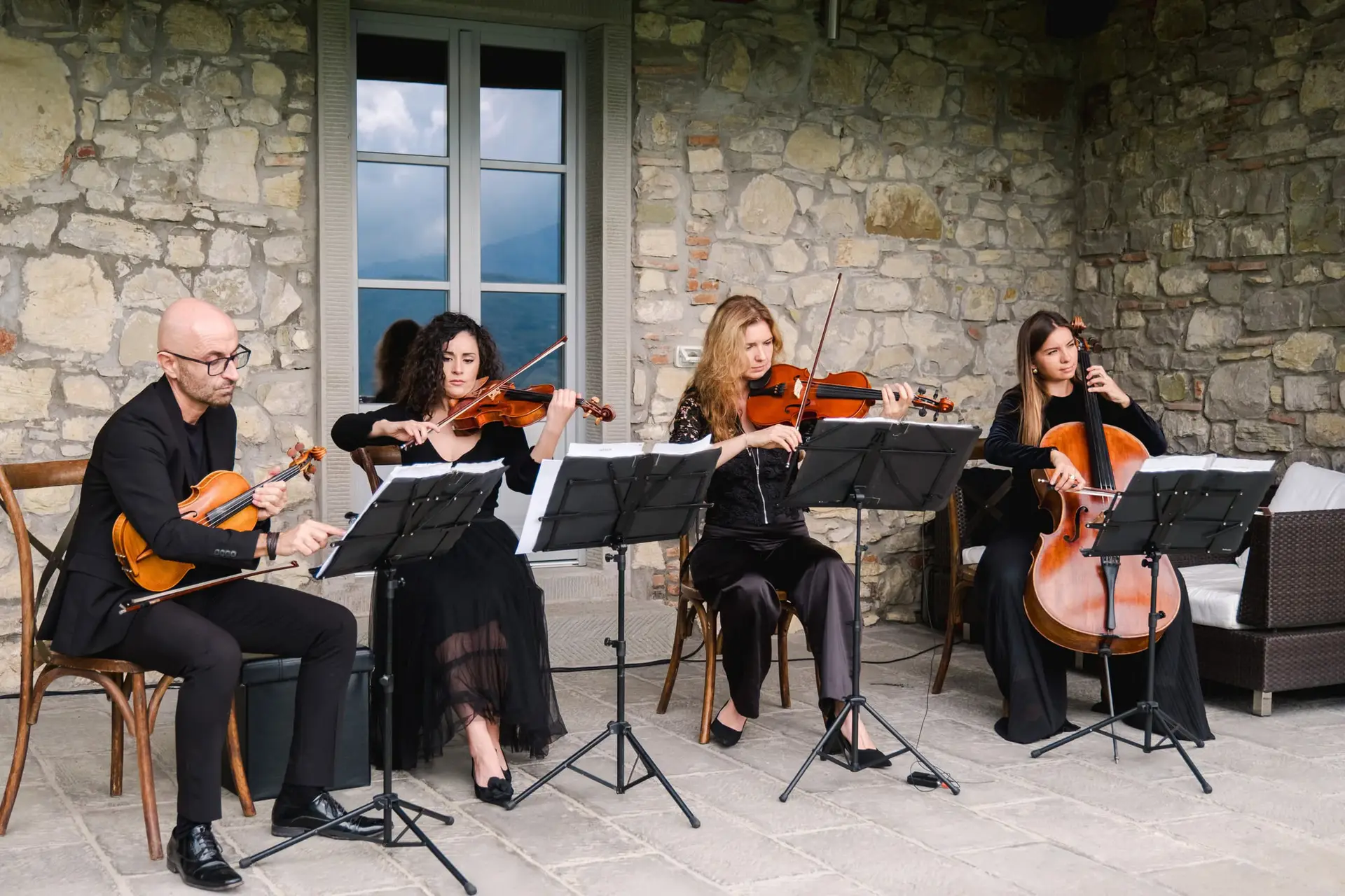 La cérémonie se tient en extérieur, entourée de nature, baignée par une lumière chaleureuse. Le paysage toscan devient le témoin discret de cet engagement. À la tombée du jour, les invités se retrouvent à l’intérieur du borgo, autour de tables soigneusement dressées. Une ambiance conviviale s’installe, faite d’échanges, de rires et de moments partagés, portée par la beauté du lieu et l’émotion du moment.
