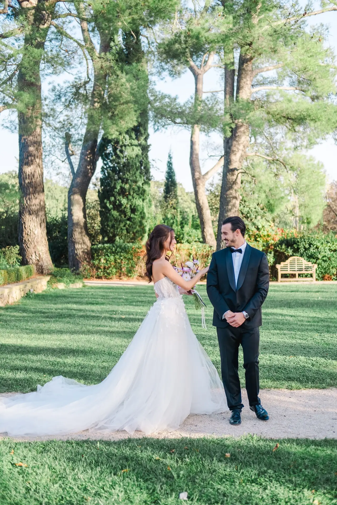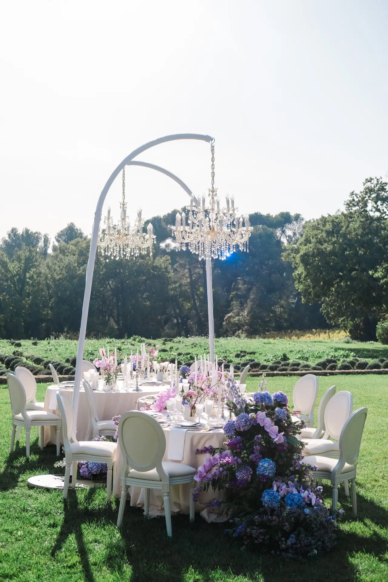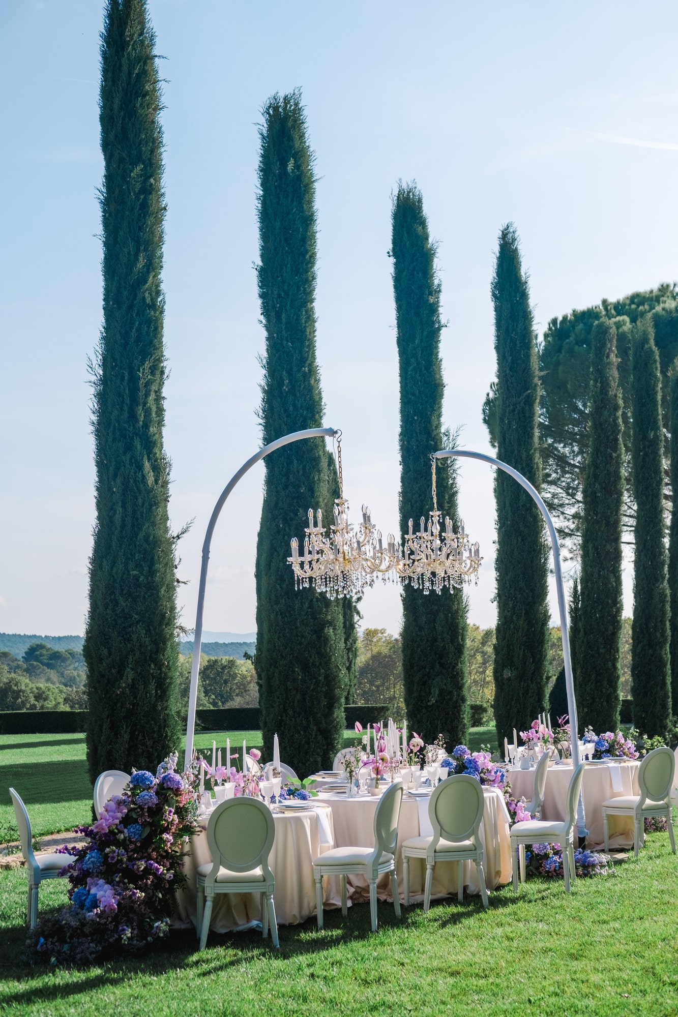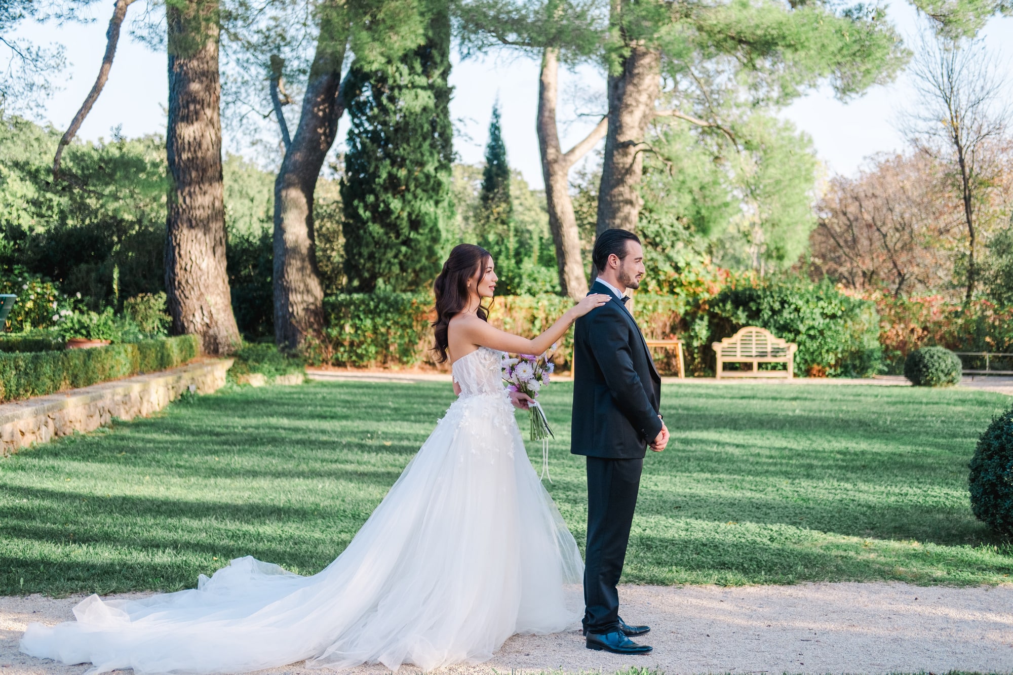 Au Château de la Gaude, chaque moment prend une dimension particulière. Une grande table dressée en extérieur, sublimée par des lustres suspendus, crée une ambiance élégante et intimiste à la nuit tombante. Le first look se déroule dans une atmosphère douce et sincère, empreinte d’émotion. La cérémonie laïque, installée dans les jardins face au château, offre un cadre naturel et apaisant, propice aux échanges authentiques. Entre lumière provençale, décors raffinés et instants partagés, ce lieu magnifie les mariages avec justesse et chaleur.